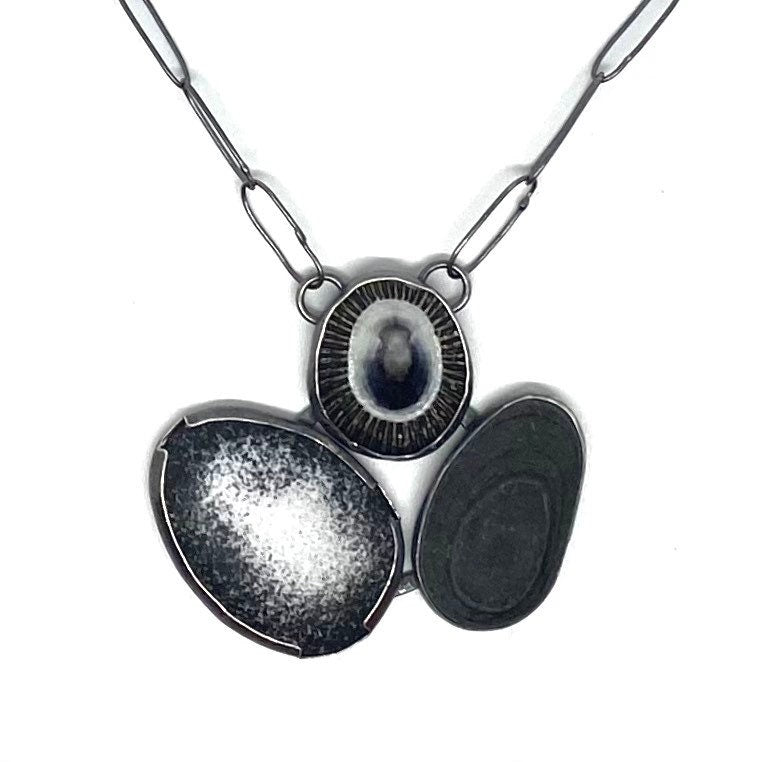 This necklace has a black rock, a shell and and a enameled shape. They are bezel set and arranged in a triangular fashion.