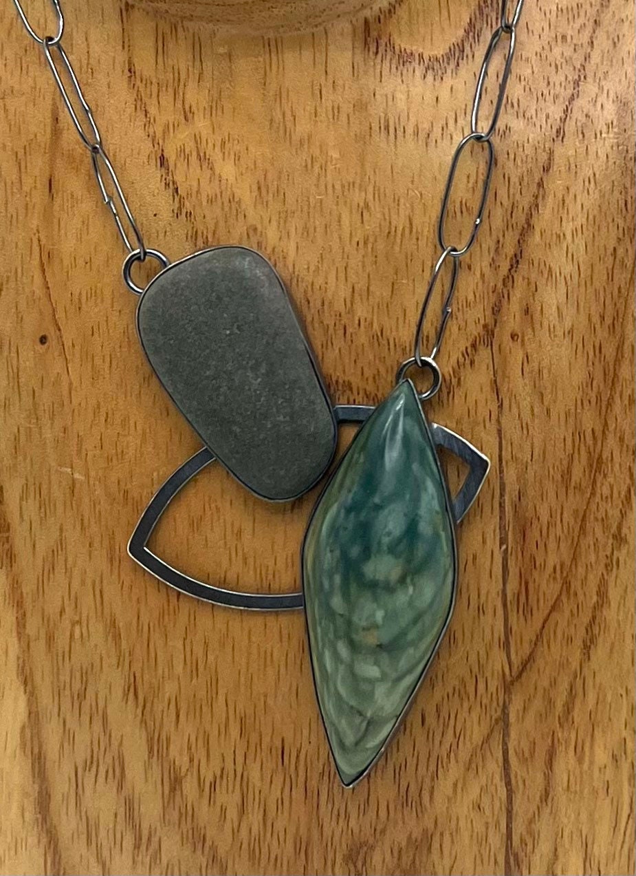 This piece is made with stones from Lake Superior and sterling silver. The silver is oxidized to get the grey color.