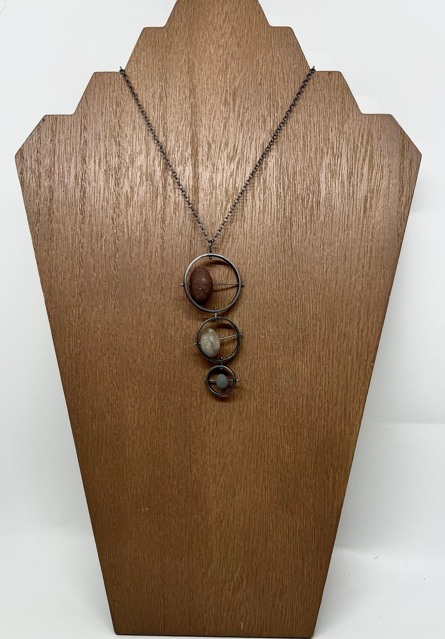 This pendant is 3 different sized circles with 3 different colored rocks pinned inside the circles.