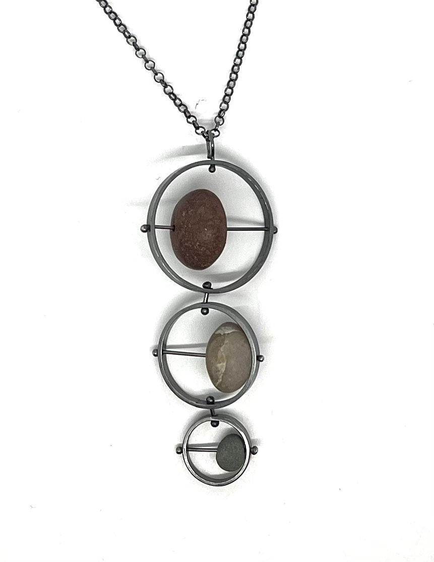 This piece is made with stones from Lake Superior and sterling silver. The silver is oxidized to get the grey color.