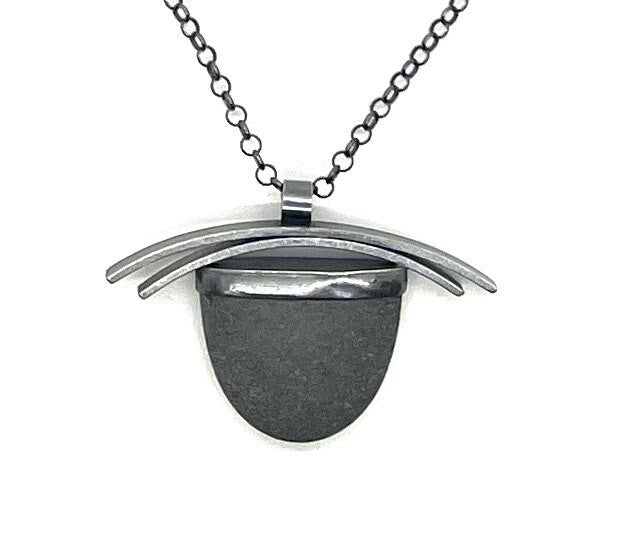 This piece is made with a stone from Lake Superior and sterling silver. The silver is oxidized to get the grey color.