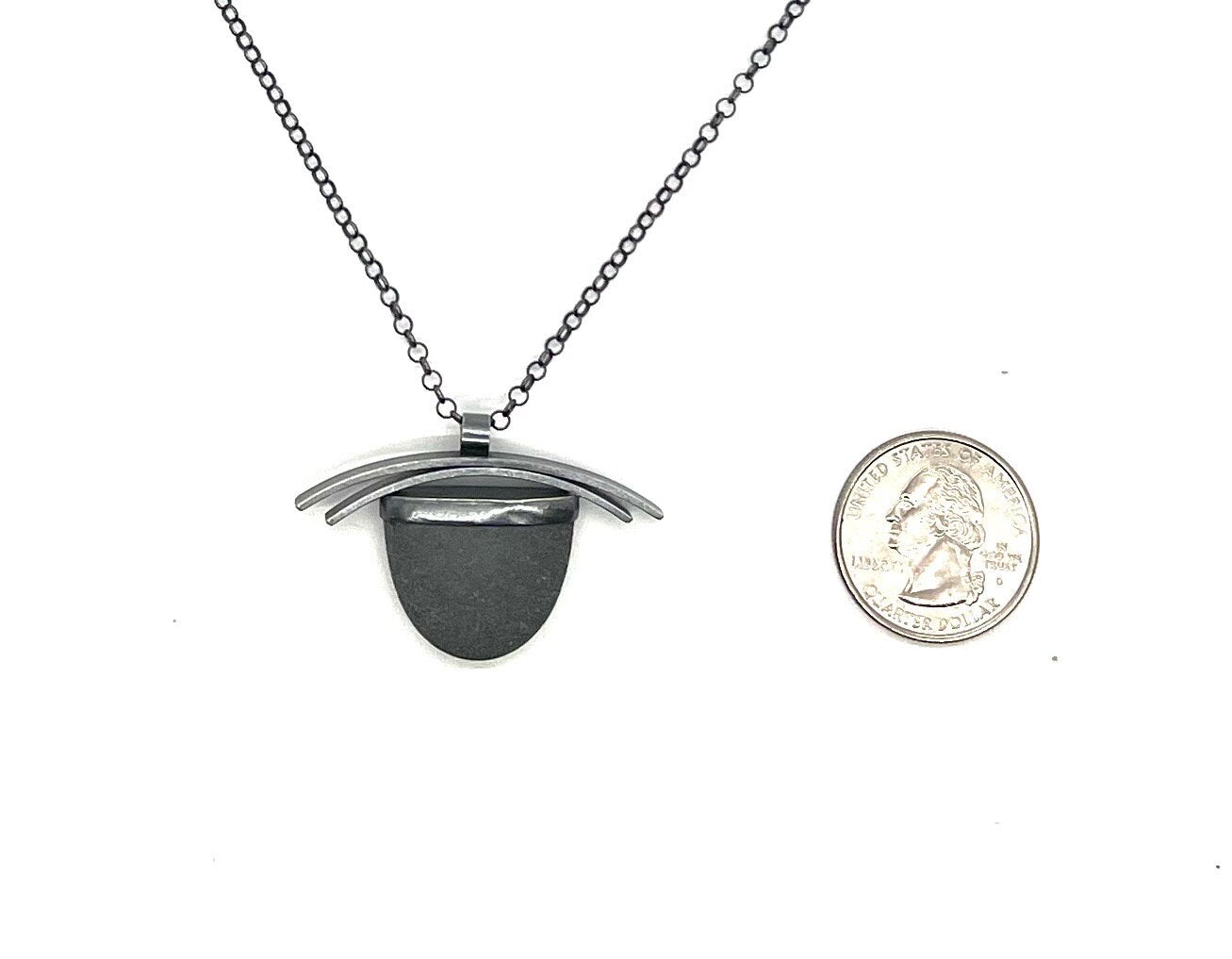 This necklace is made with half of a medium grey rock that has been bezel set and two curved pieces of wire are soldered to the top. It is on a heavy rolo chain with a lobster clasp.