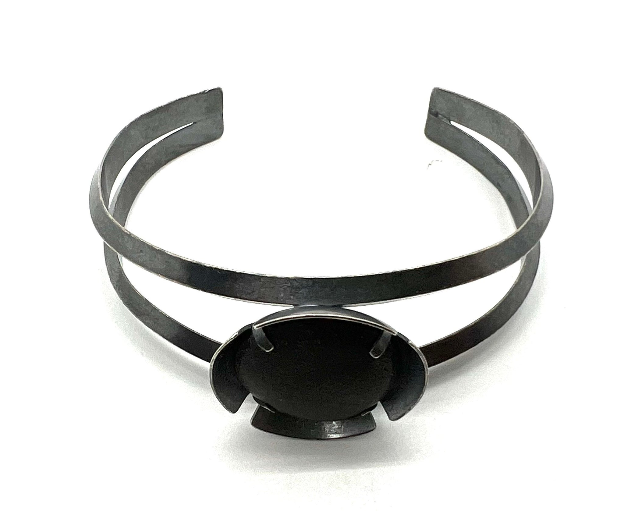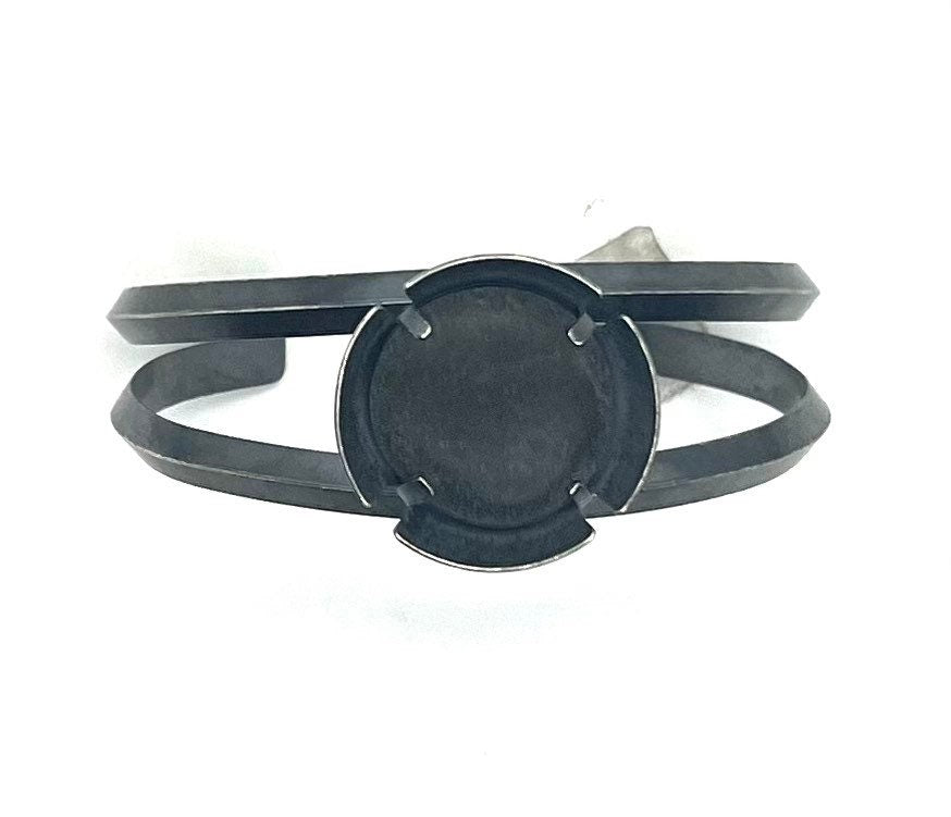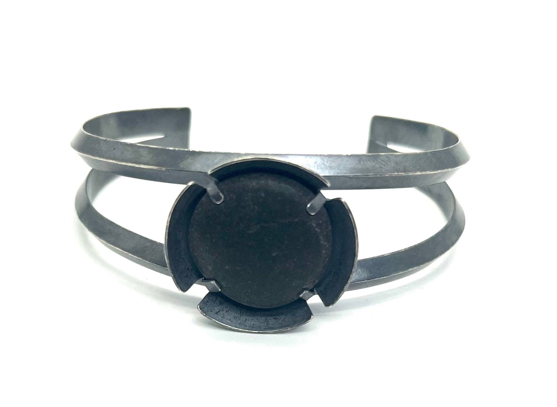 This rock is dark grey, and is prong/tab set inside a dome that is placed in of cuff of two triangle shaped wires.