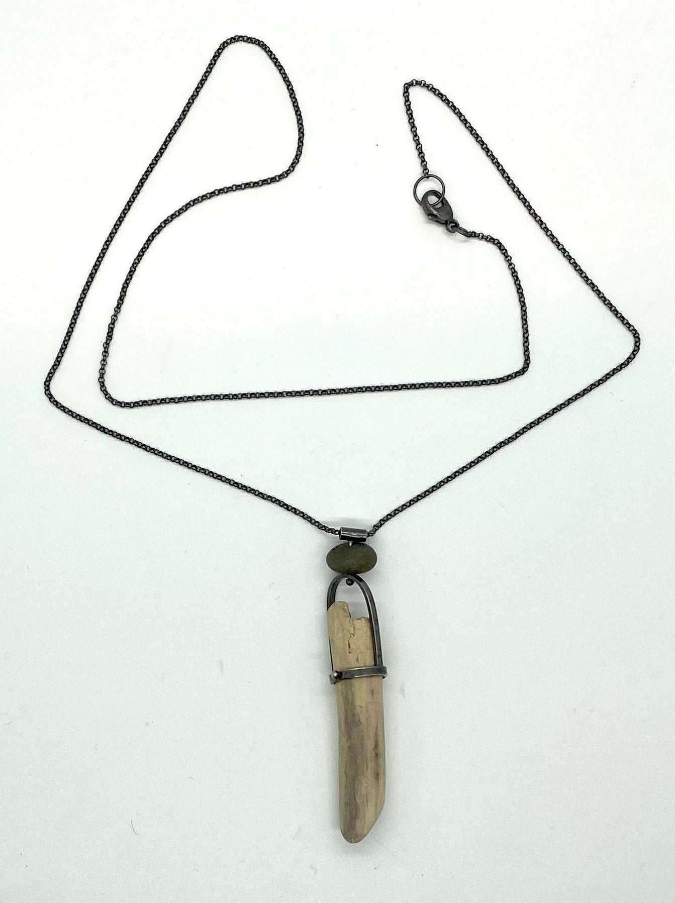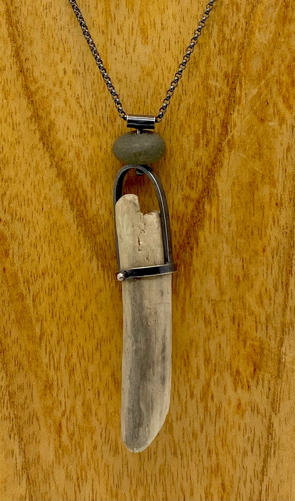 This necklace is a driftwood stick with a silver harness. It has medium grey pebble on top.
