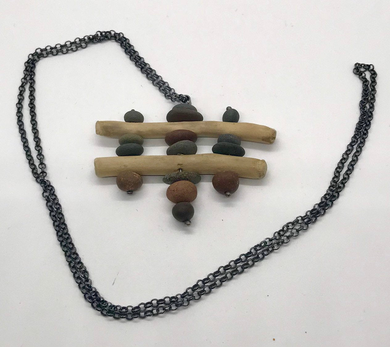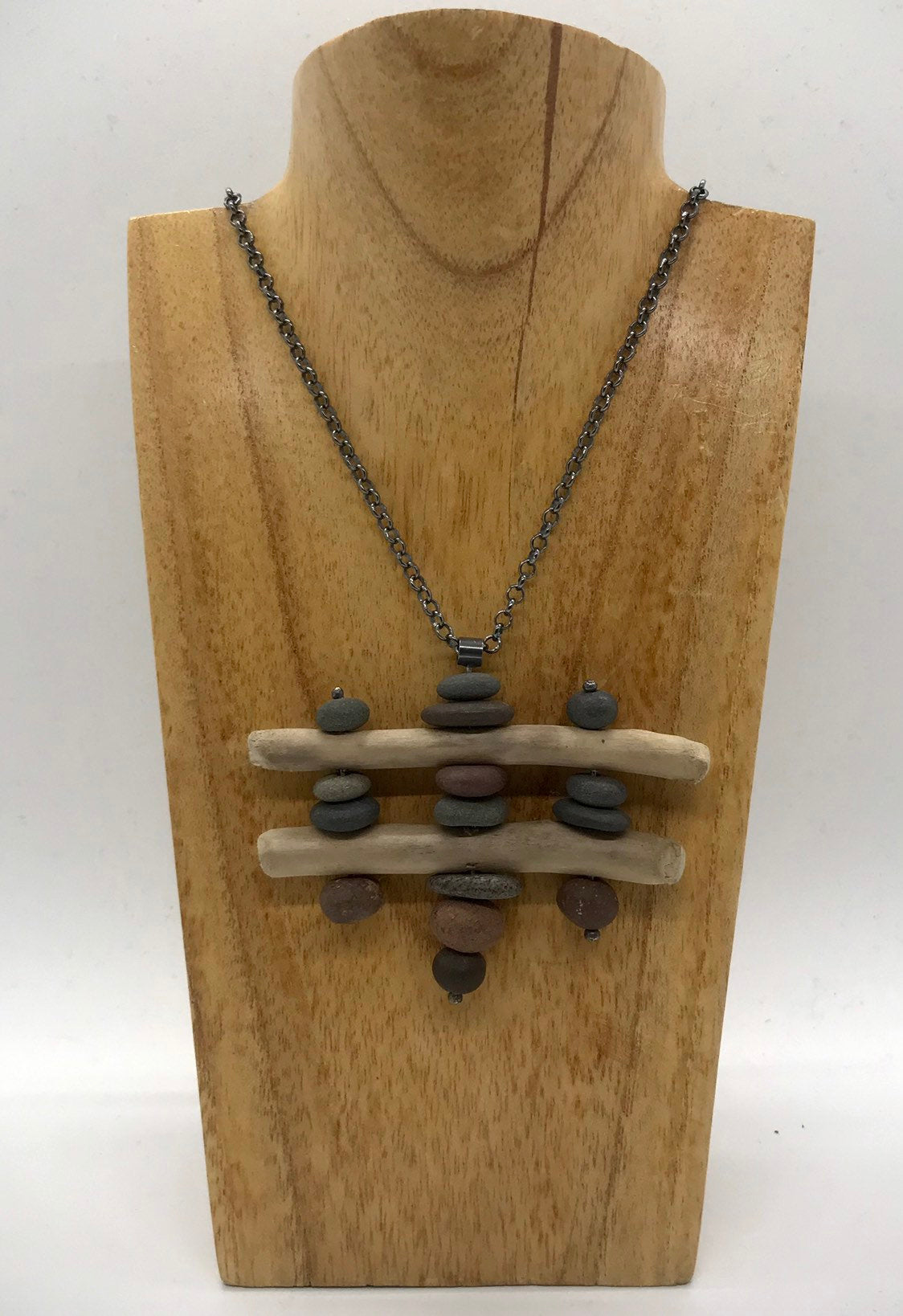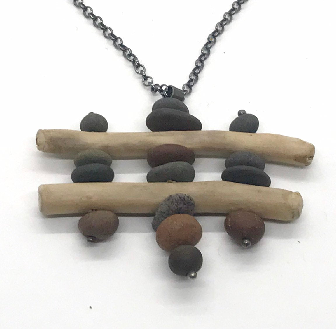 This pendant is made with rocks and driftwood. It is a mini version of a sculpture we make.