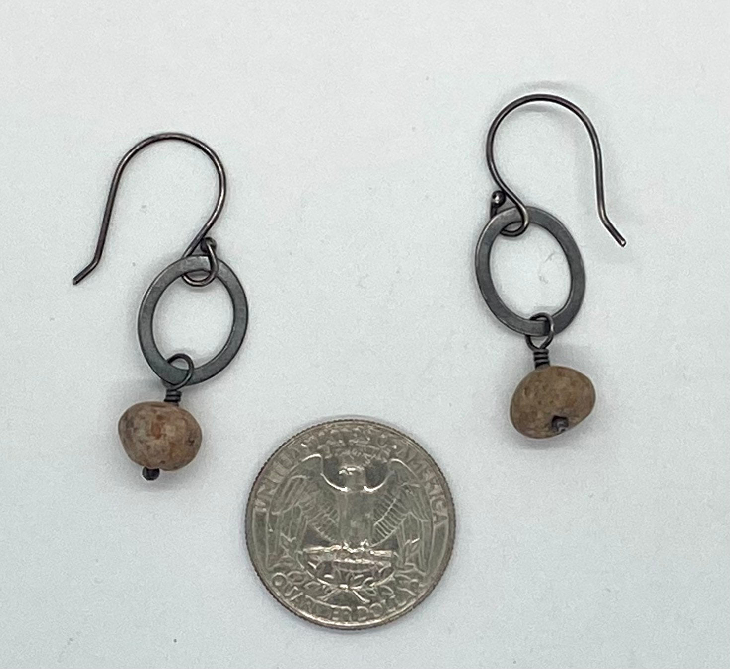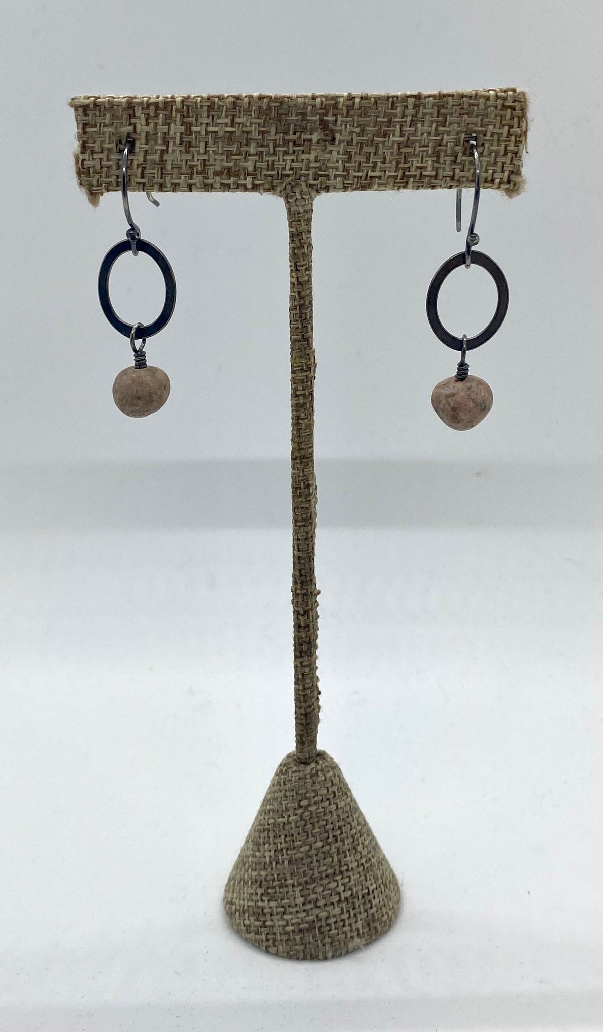 These earrings are a flattened circle with a cream granite rock dangle. The earwires are sterling silver and handmade.