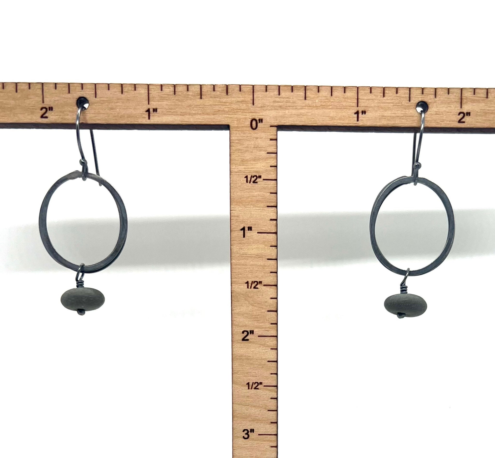 These earrings are made with stones from Lake Superior and sterling silver. The silver is oxidized to get the grey color.