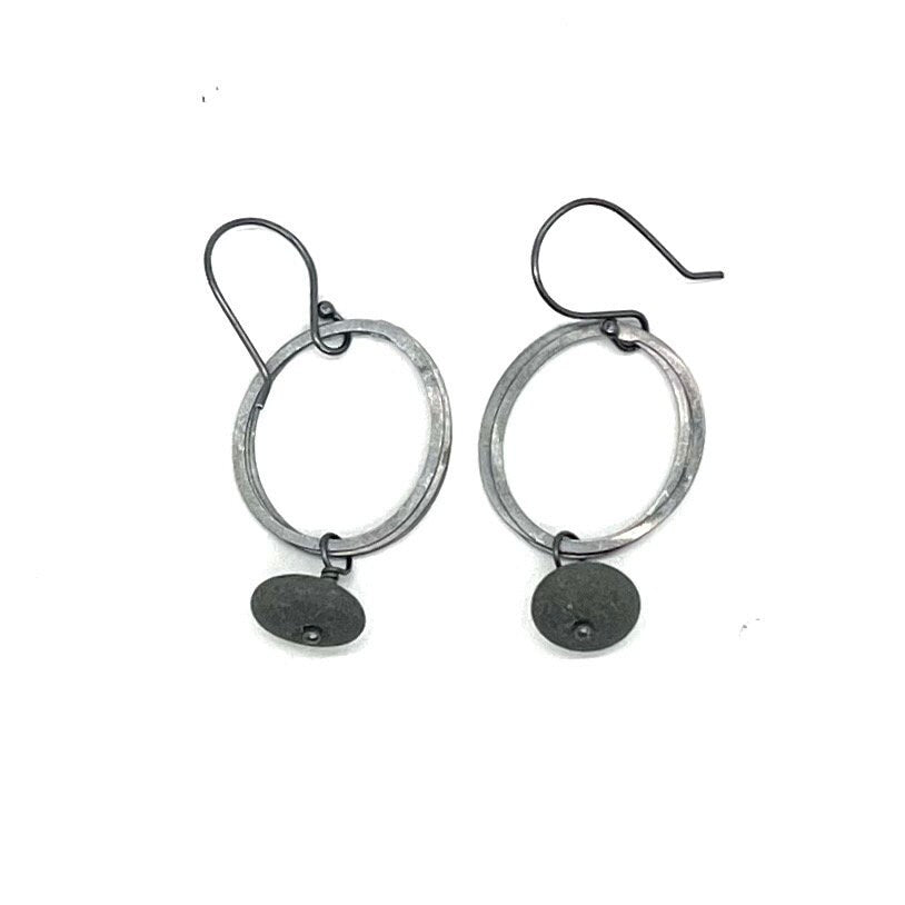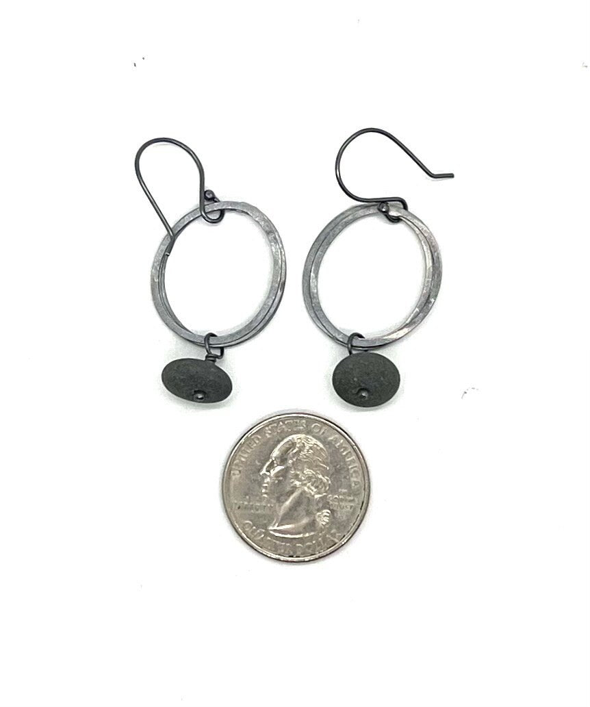 These earrings have 3 flattened ovals with a light grey rock dangle. The earwires are sterling silver and handmade.