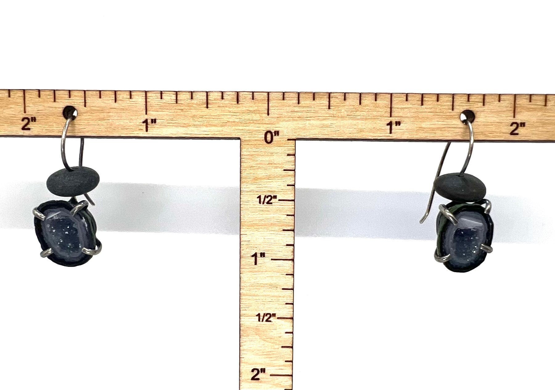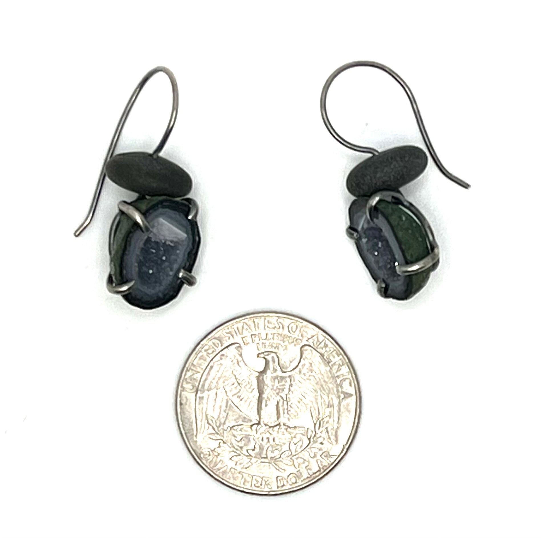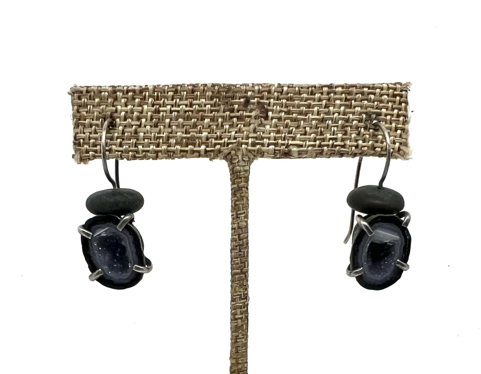 These earrings have black rocks on top of a small Tabasco geode that is prong set. The earwires are sterling silver and handmade.