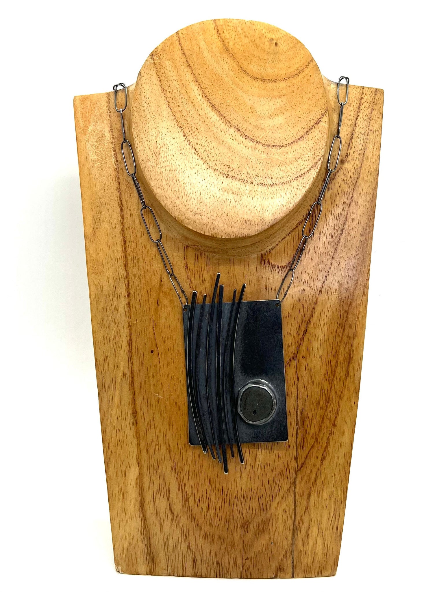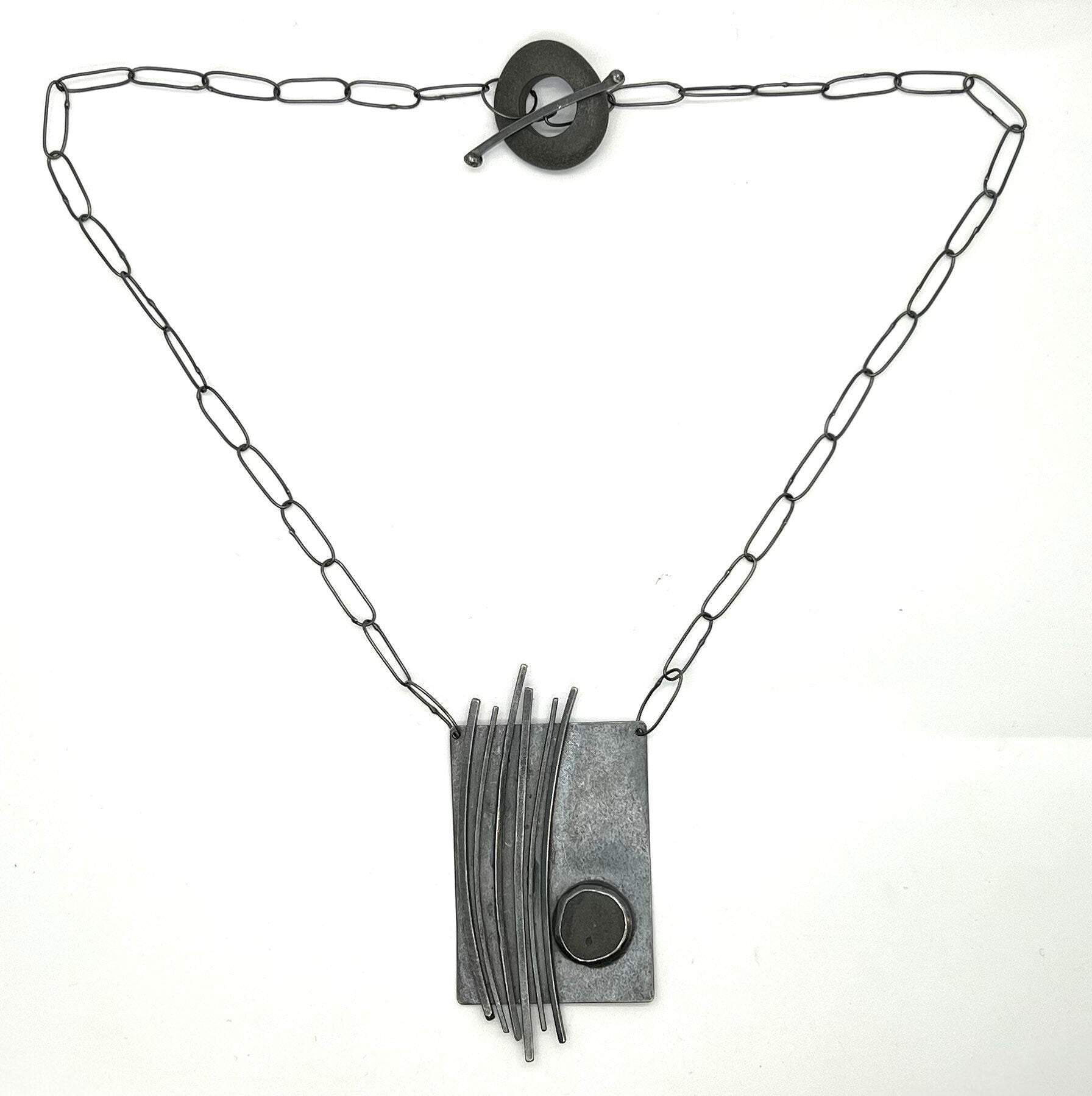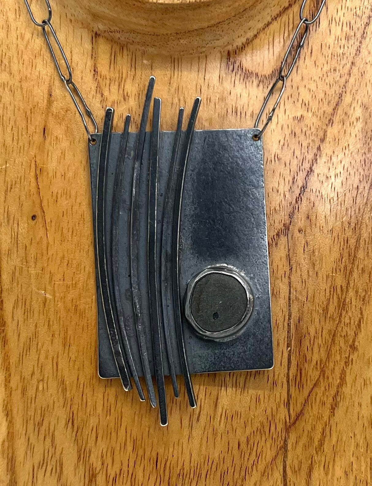 This necklace is a dark grey rock, bezel set and sterling bars soldered vertically across the side. It has a handmade chain with a rock toggle clasp attached.