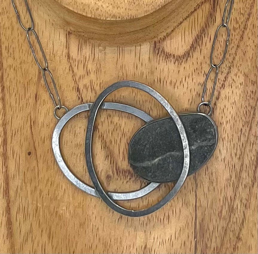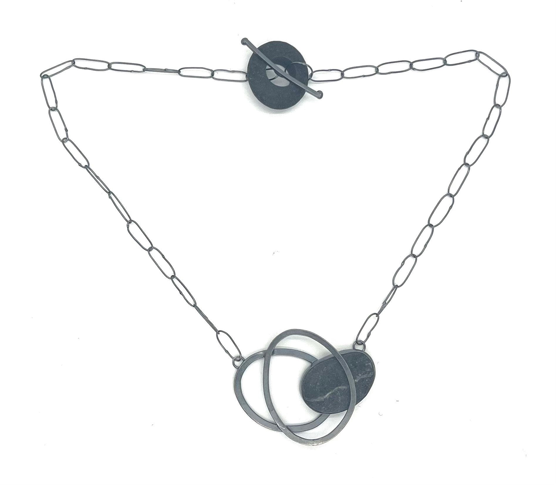 This necklace has a pendant section of layered ovals with a dark grey rock with a line in it, bezel set. It has a handmade chain with a rock toggle clasp.