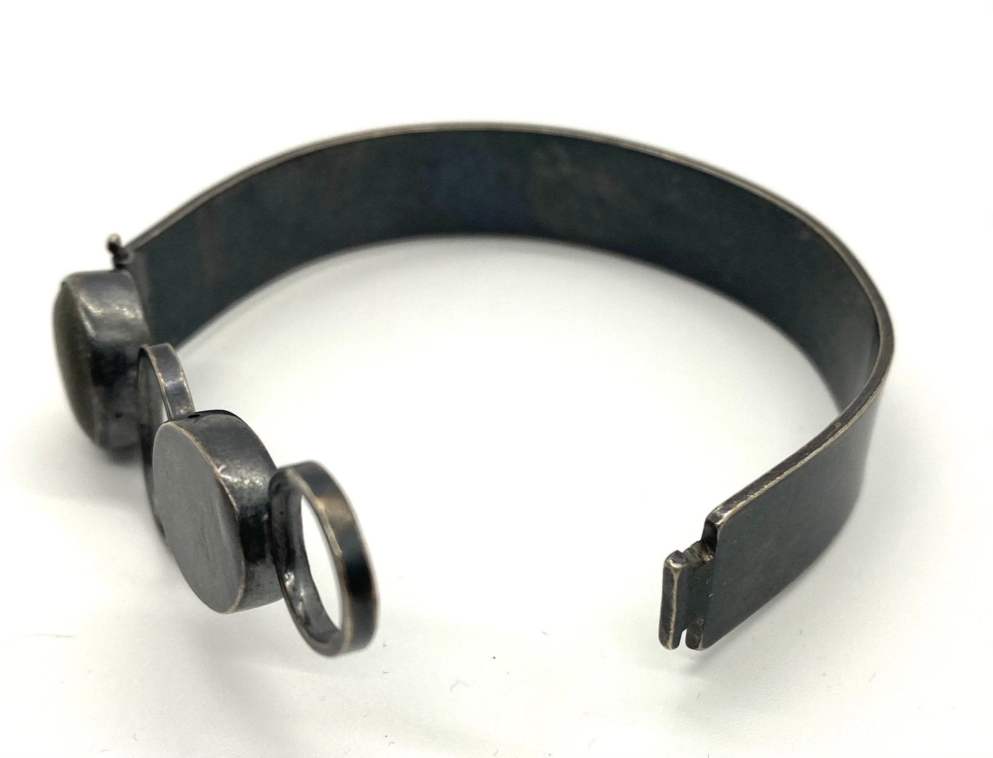 This bracelet is a line of rock shapes. There is one bezel set dark grey rock, 2 open ovals and one hollow form”rock”.