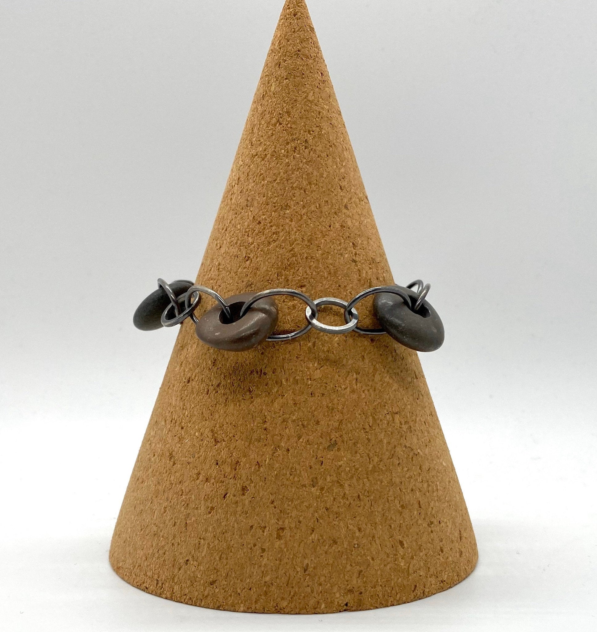 This piece is made with stones from Lake Superior and sterling silver. The silver is oxidized to get the grey color.
