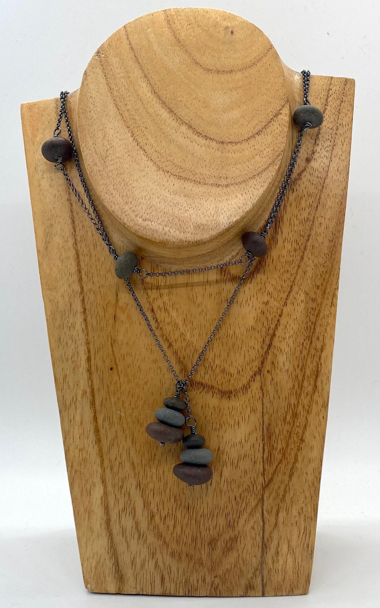 This piece is made with stones from Lake Superior and sterling silver. The silver is oxidized to get the grey color.