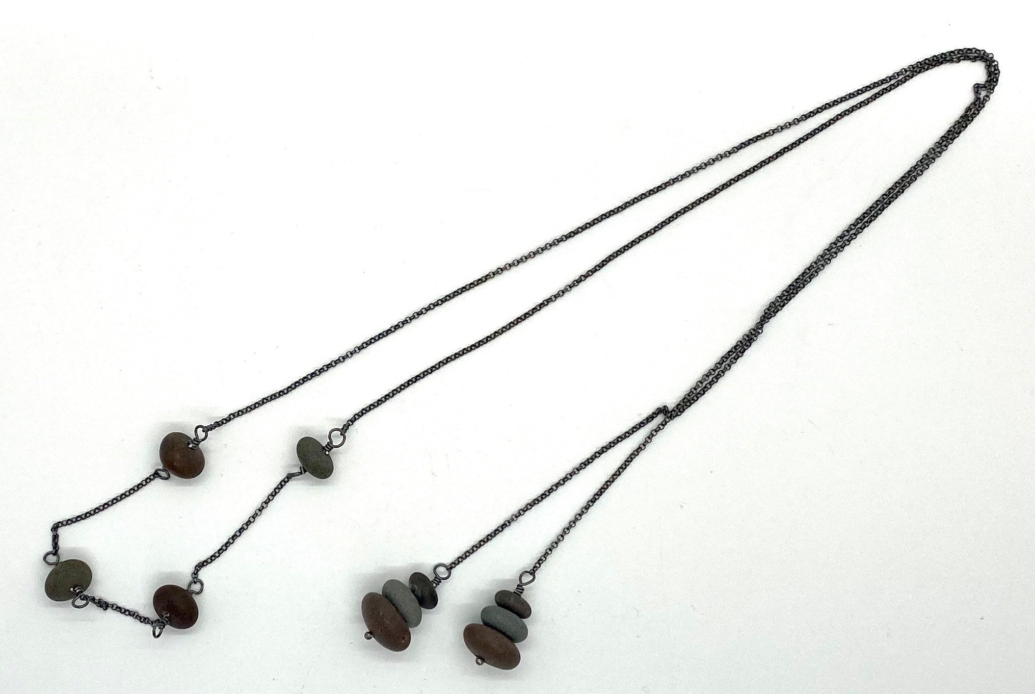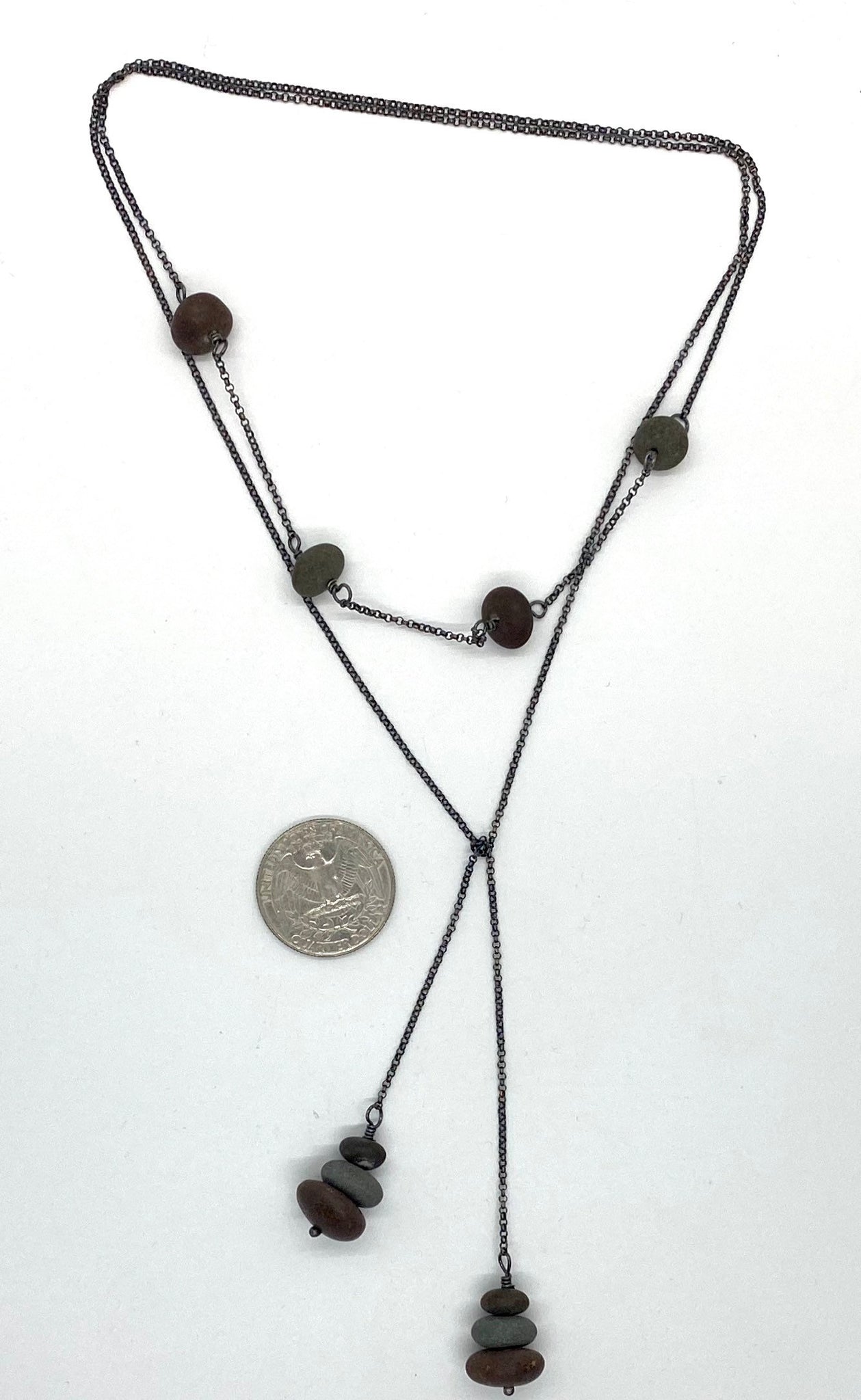 This piece has two stacks of three rocks on the ends and four rocks in the middle. It is a lariat and is tied like a scarf. It can be worn long, tied in front or wrapped around twice to be worn short.