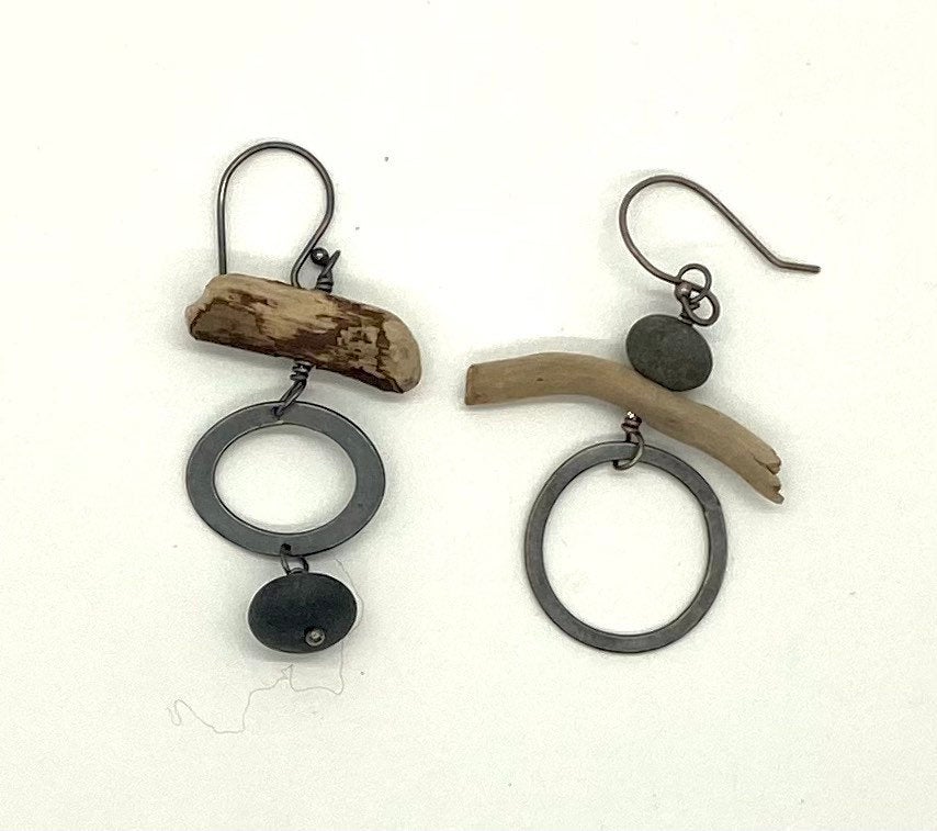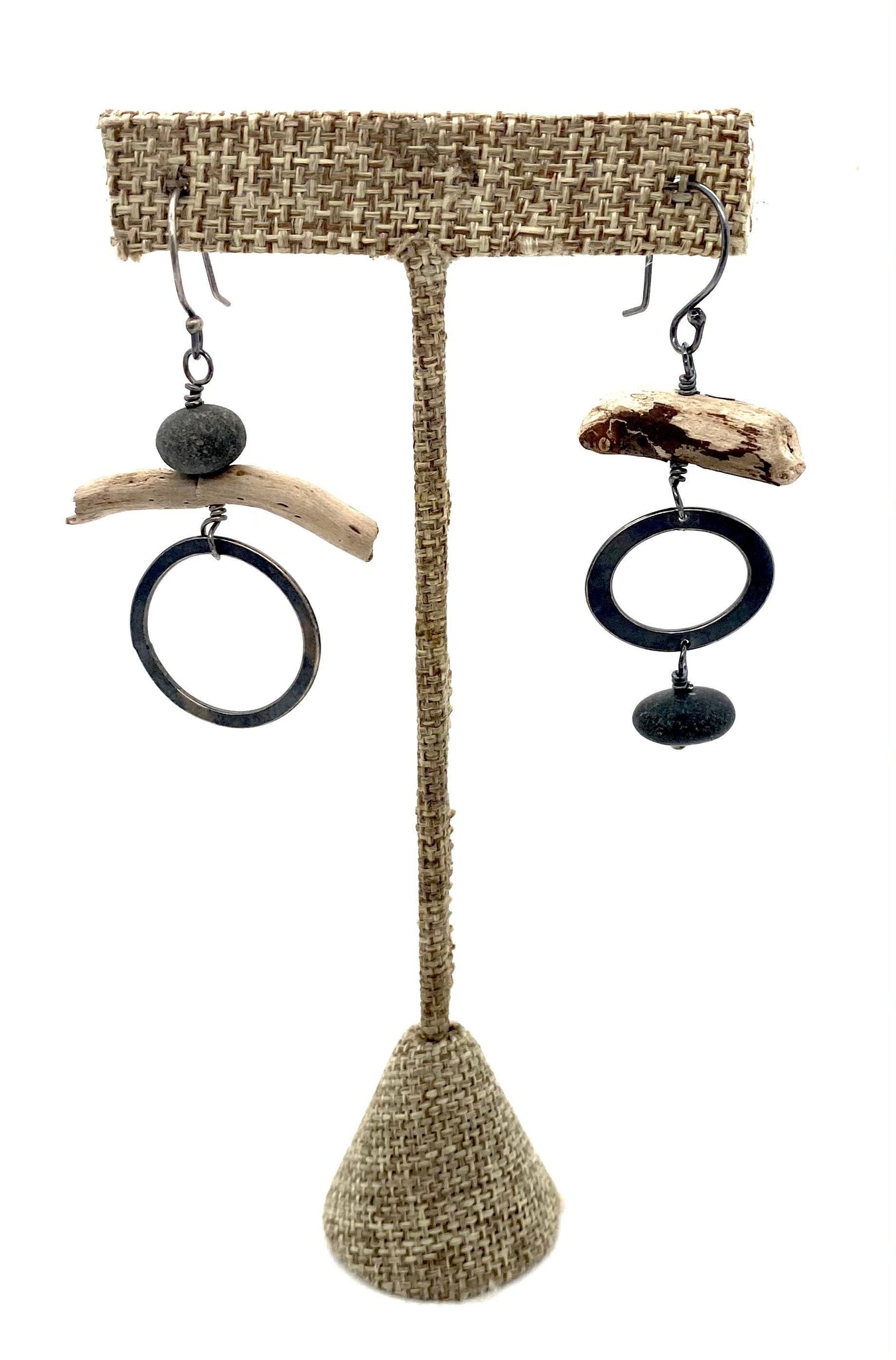 These earrings are two different earring with driftwood, silver rings and dark grey rocks The earwires are sterling silver and handmade.