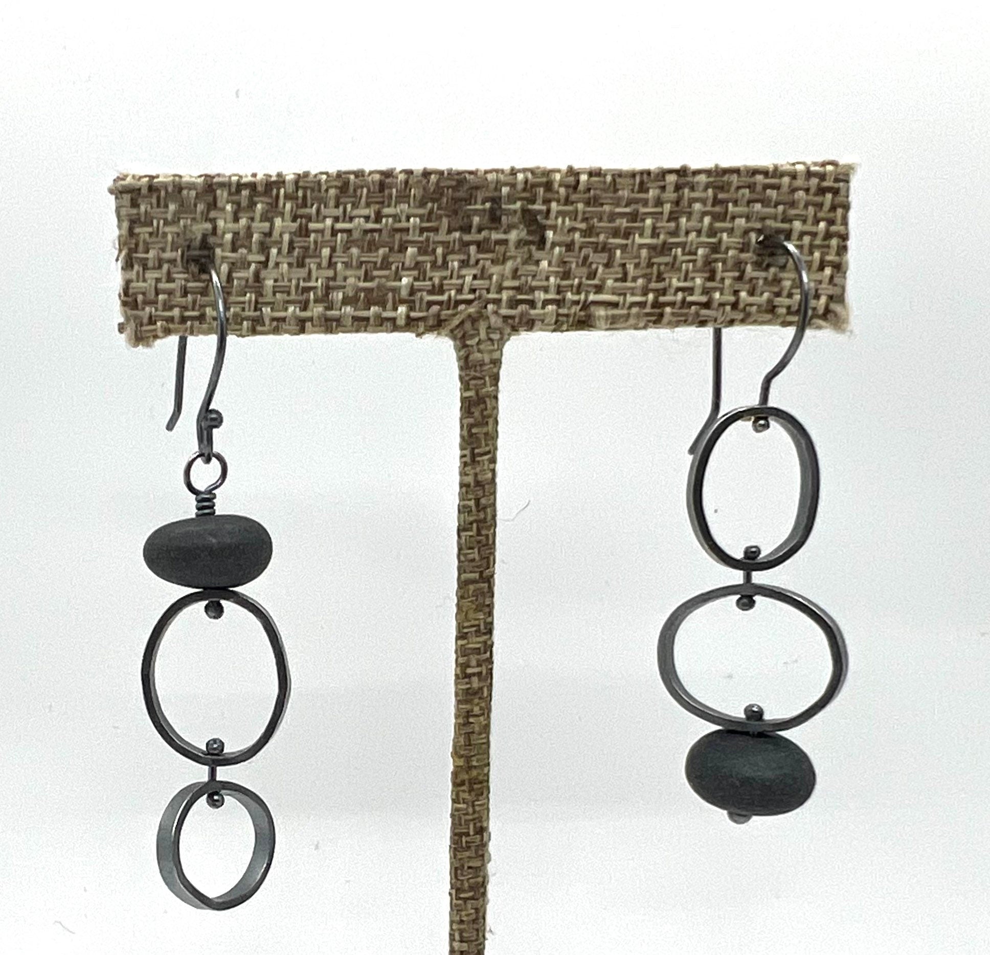 These earrings are made with stones from Lake Superior and sterling silver. The silver is oxidized to get the grey color.