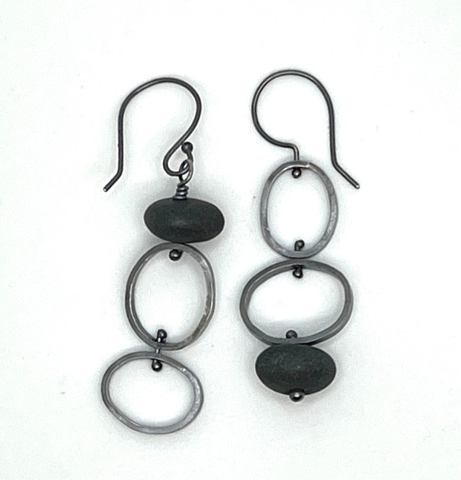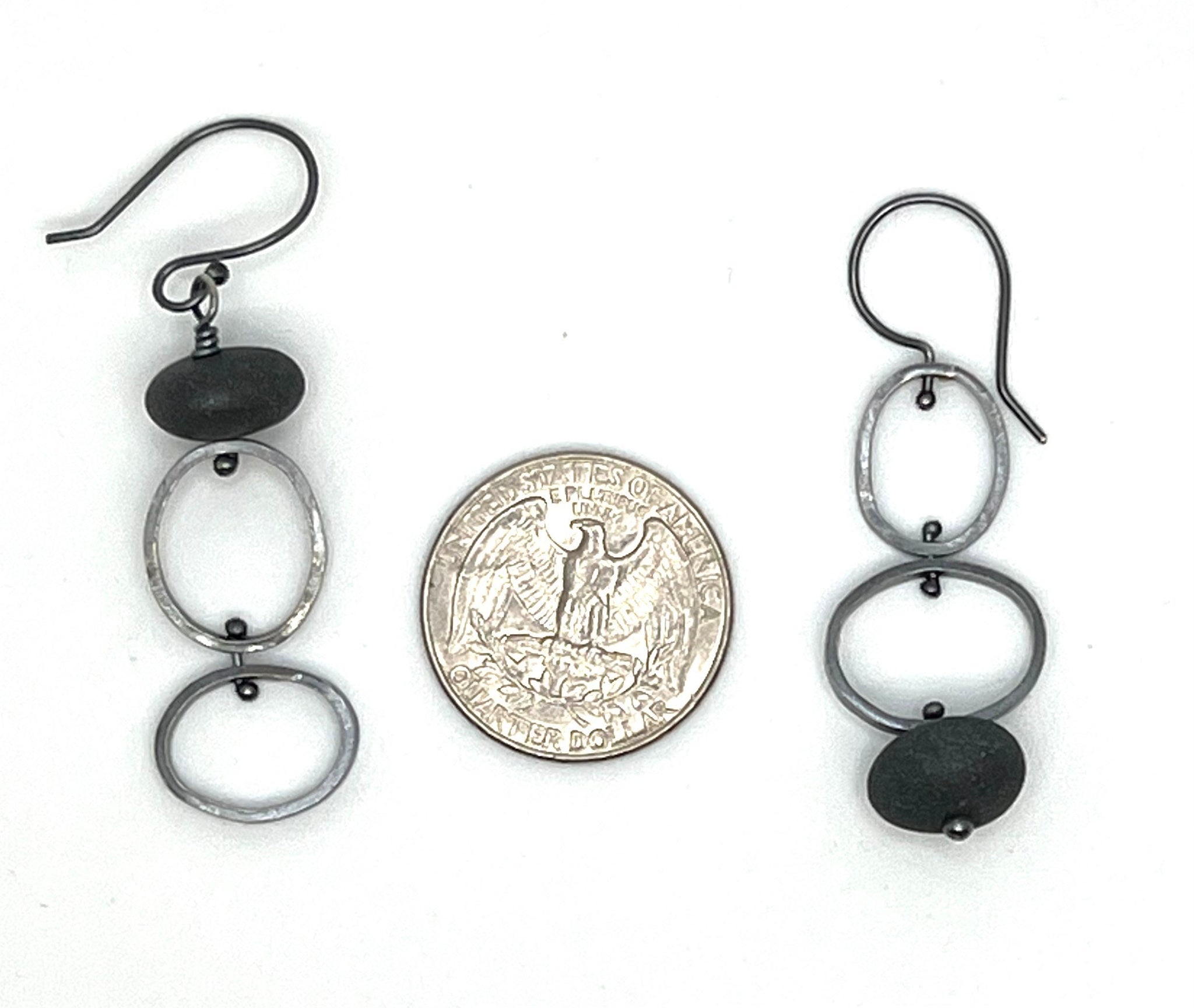 These earrings are two different earring with two silver ovals and dark grey rocks The earwires are sterling silver and handmade.