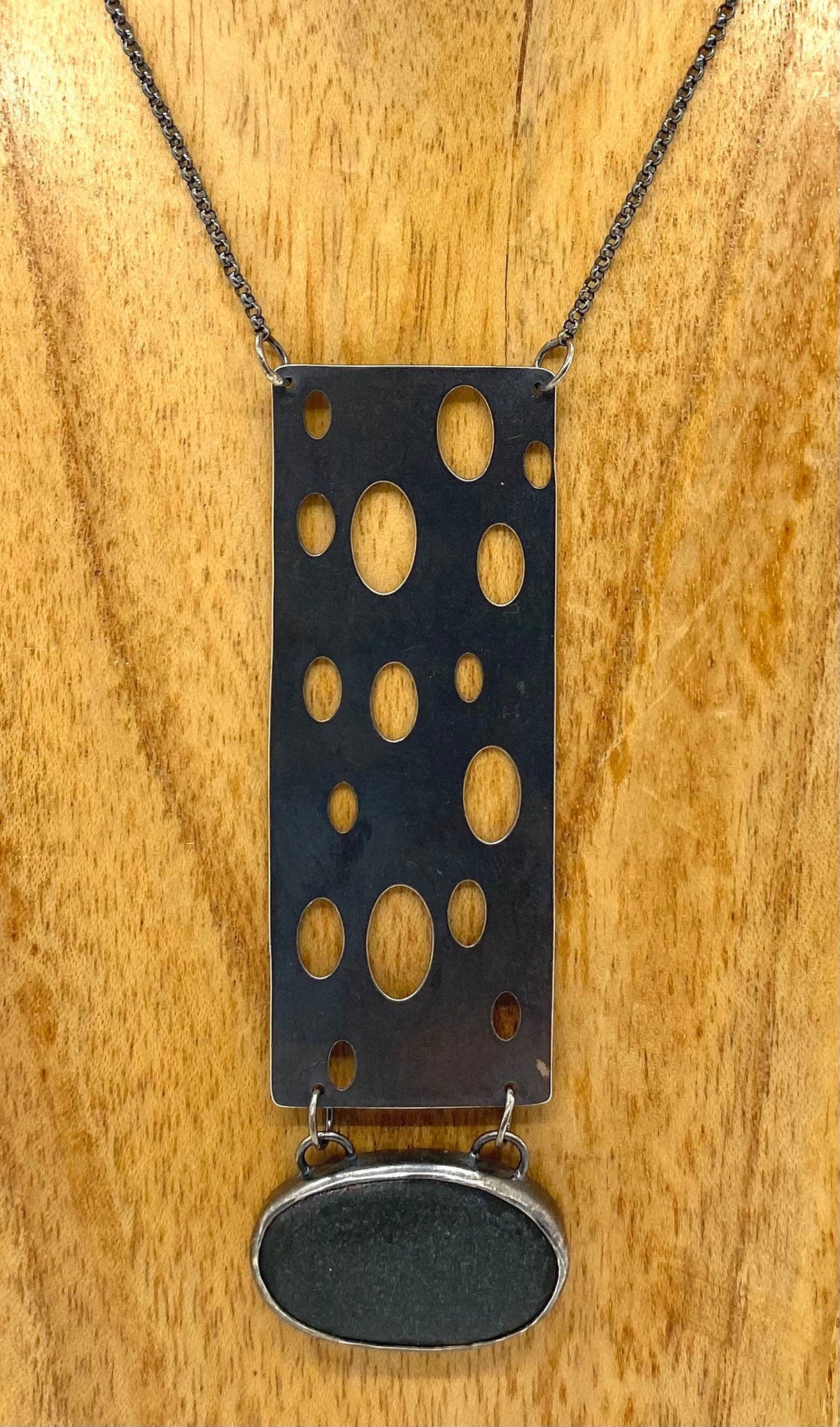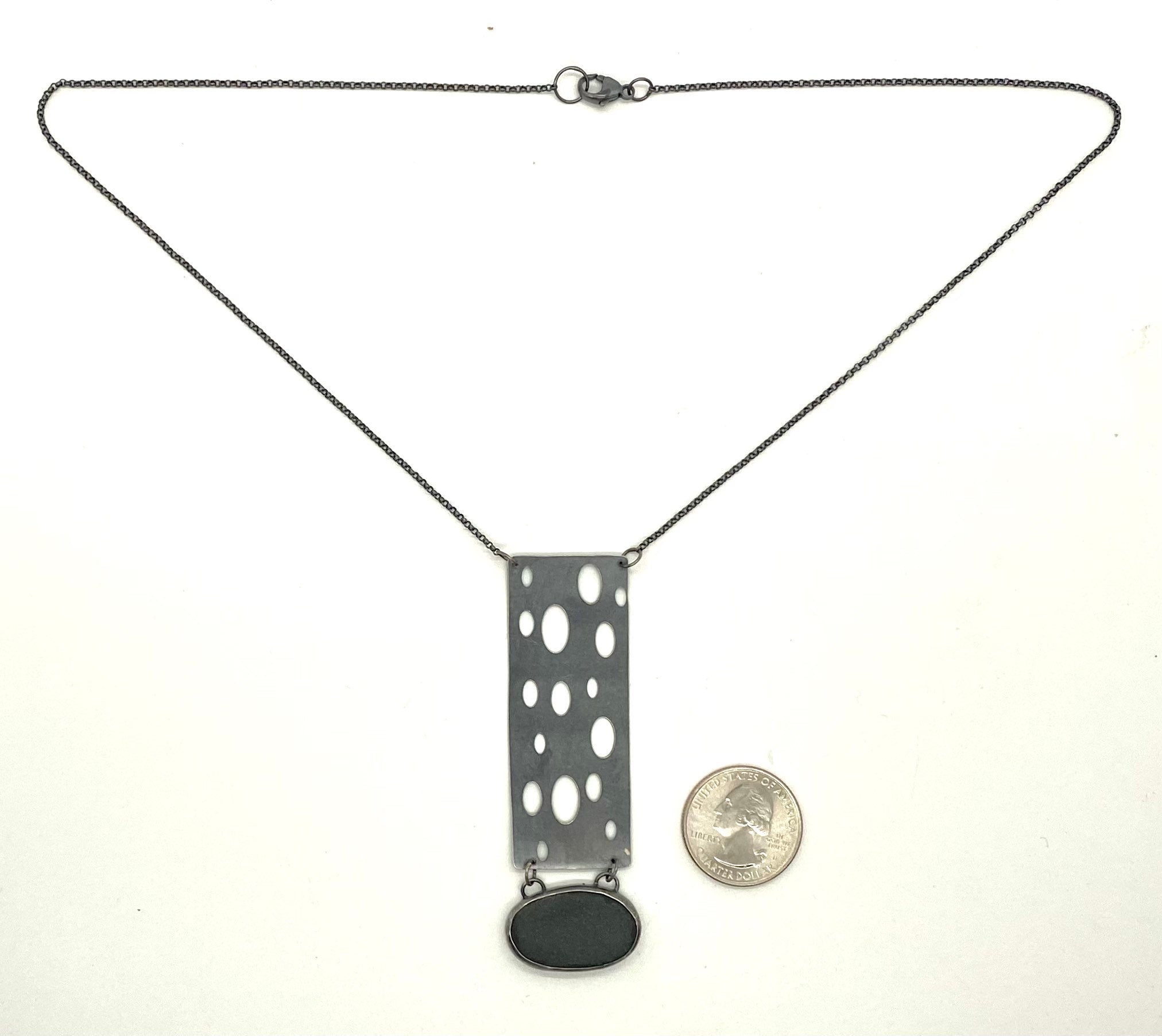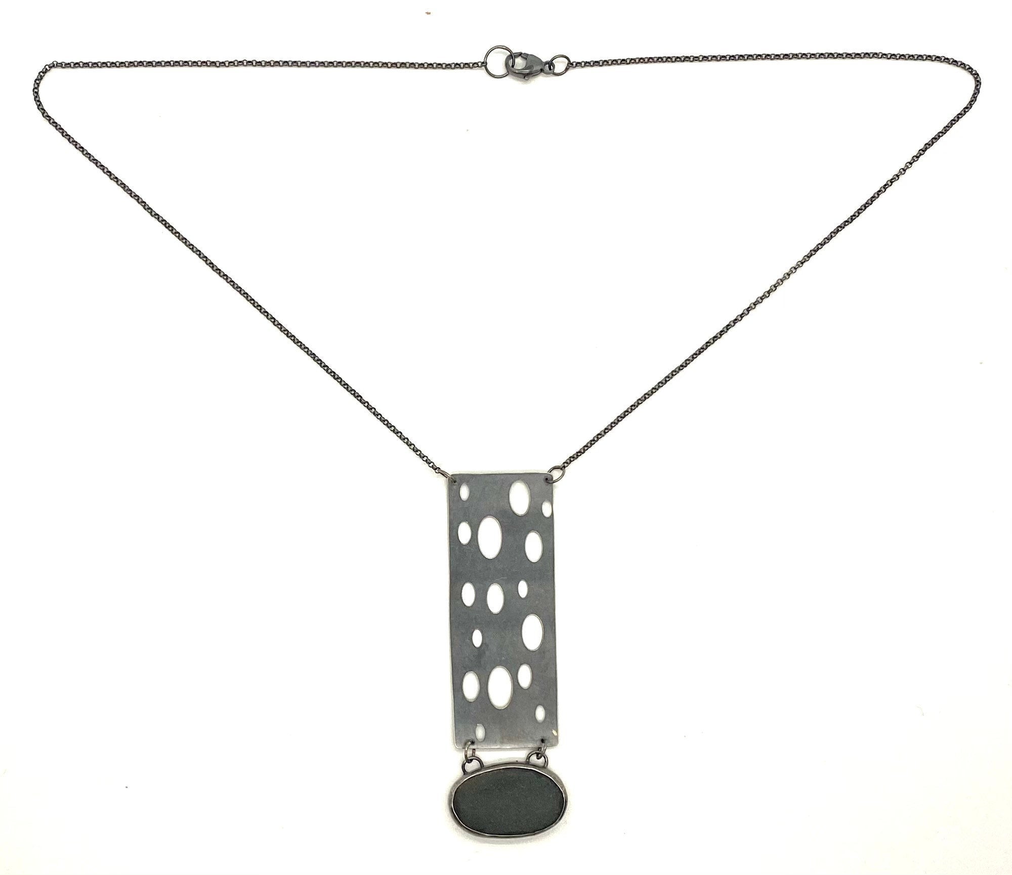 This pendant is a silver rectangle that I put holes in and the stretched it out to make them ovals. It has a dark grey rock bezel set on the bottom. It is on a sterling rolo chain with a lobster clasp.