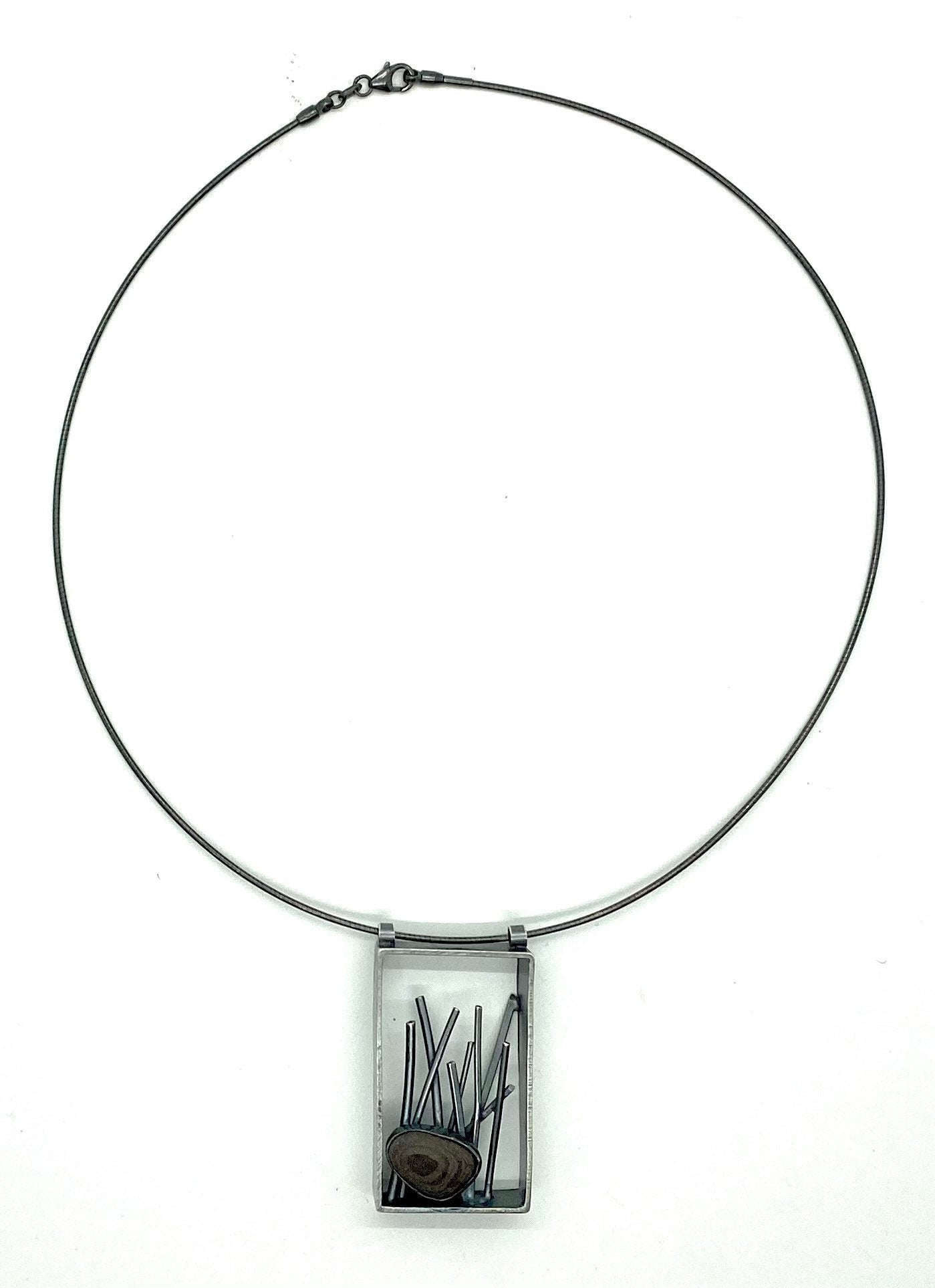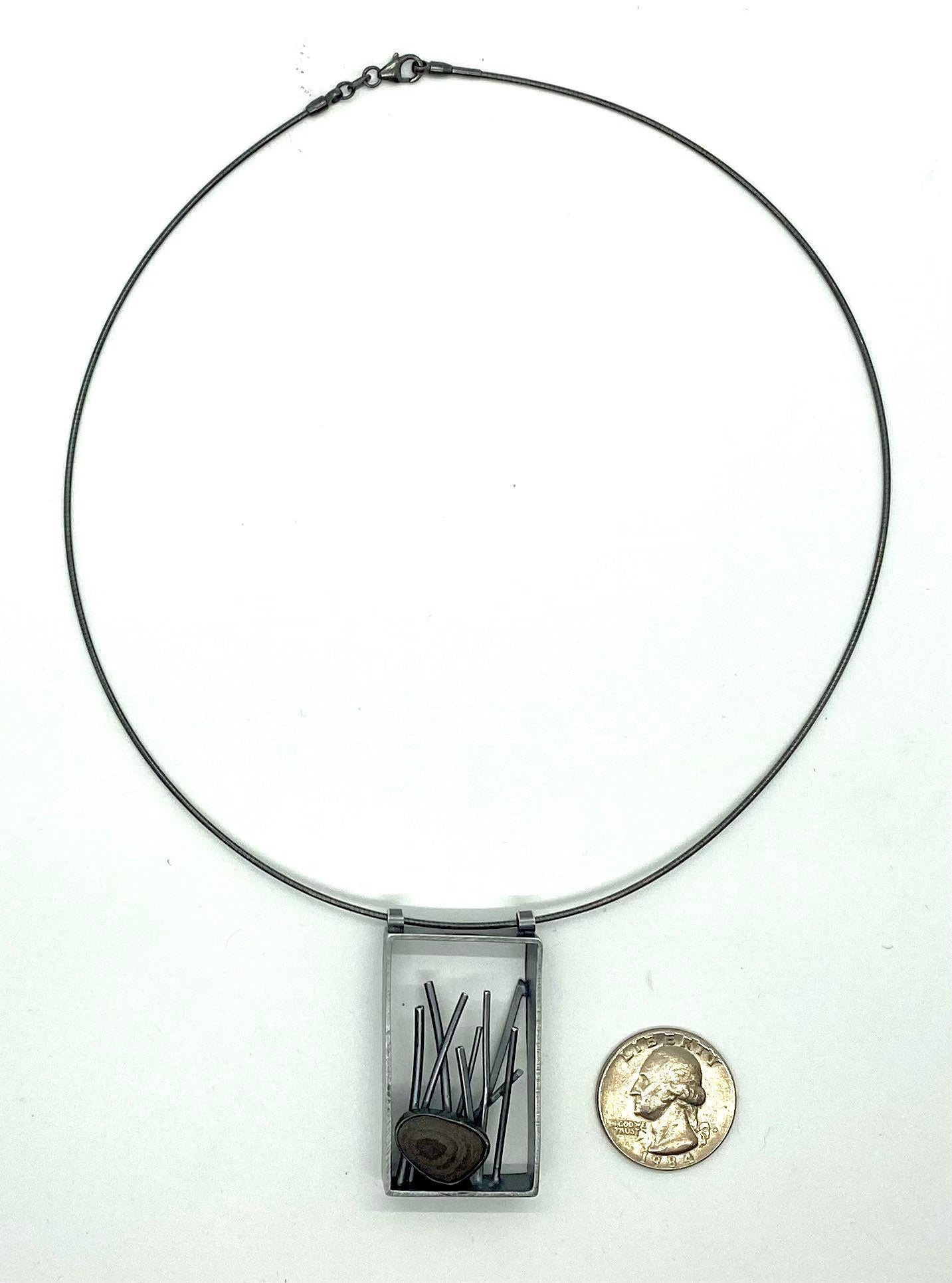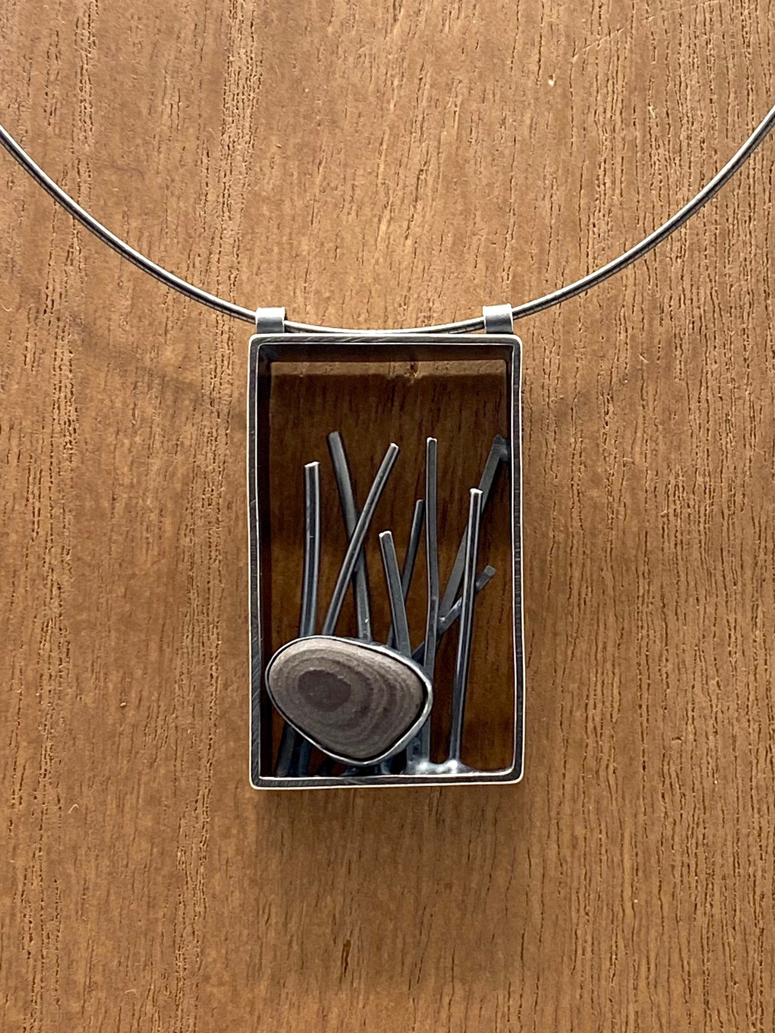 This pendant is silver wire of different thickness and shapes, that to me, resemble grass. They are set into a silver rectangle with a brown bezel set rock sitting in front of the grass. It is on an omega chain with a lobster clasp.