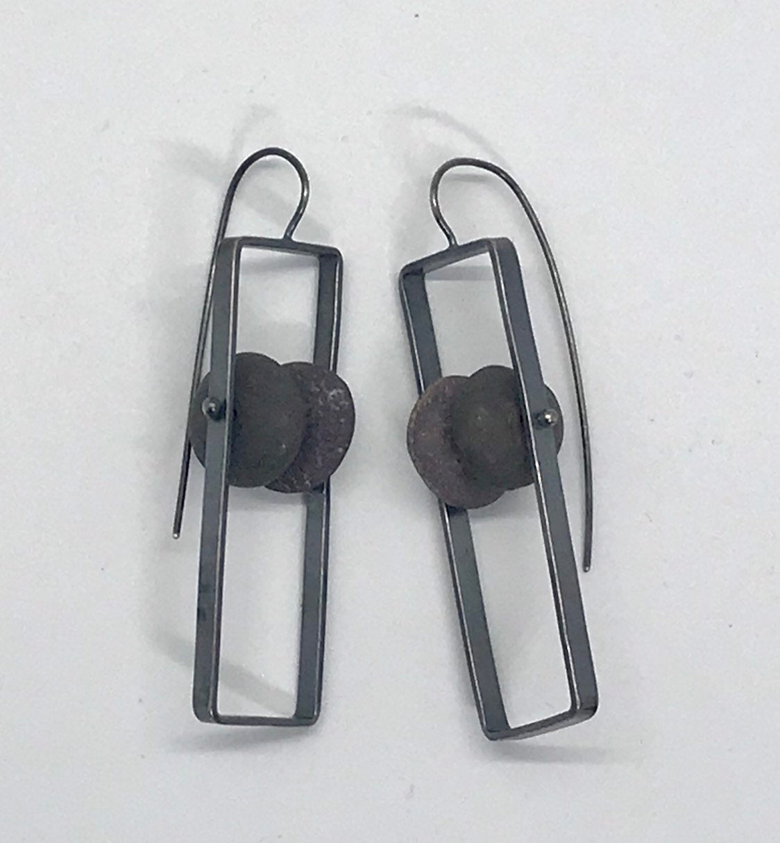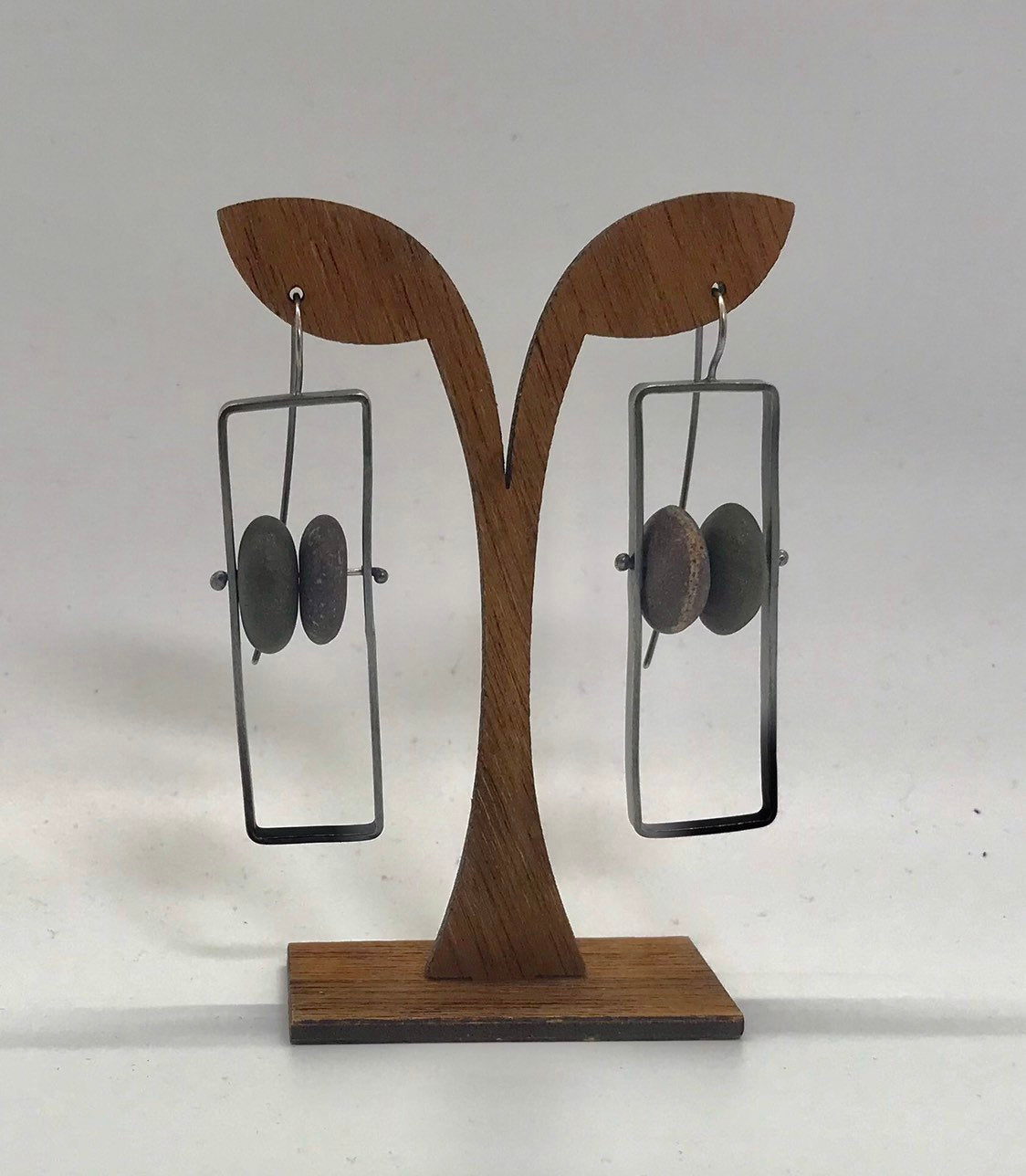 These earrings are large rectangles with one dark brown and one dark grey rock pinned inside. **One of the brown rocks has a ring around the edge, if this is gonna drive you nuts don’t buy it.** The earwires are sterling silver and handmade.