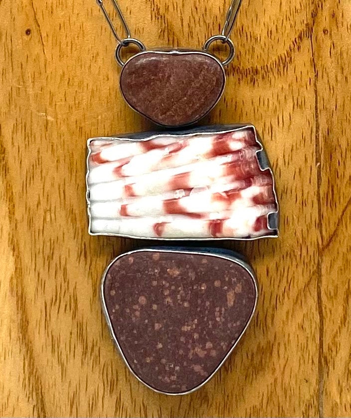 This necklace has a two reddish rocks above and below a piece of cut shell. They are bezel set and soldered into a stack.