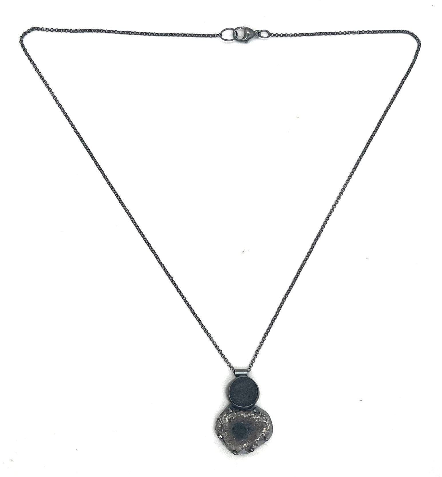 This necklace has a black rock, bezel set and a slice of amethyst stalactite that is prong set below it.(I didn’t find that one)