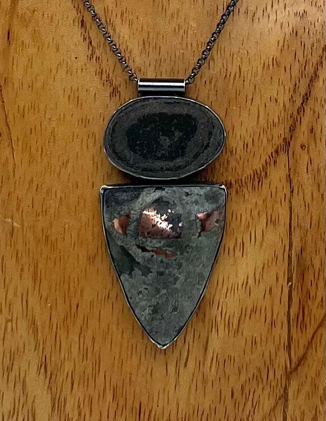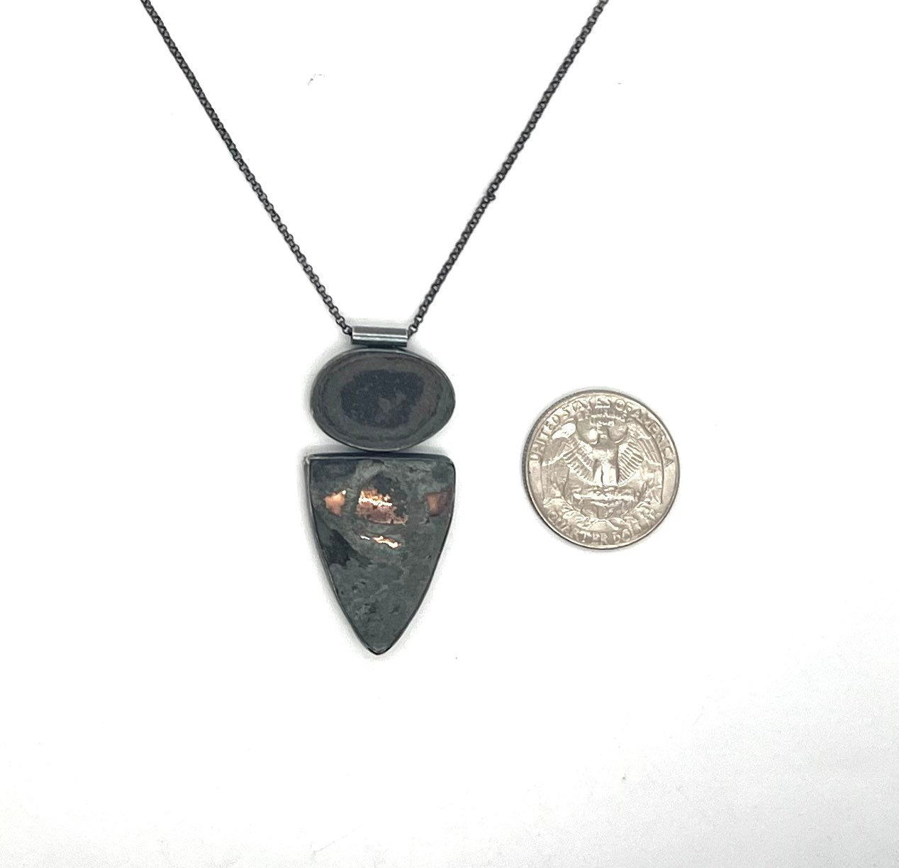 This piece is made with stones from Lake Superior and sterling silver. The silver is oxidized to get the grey color.