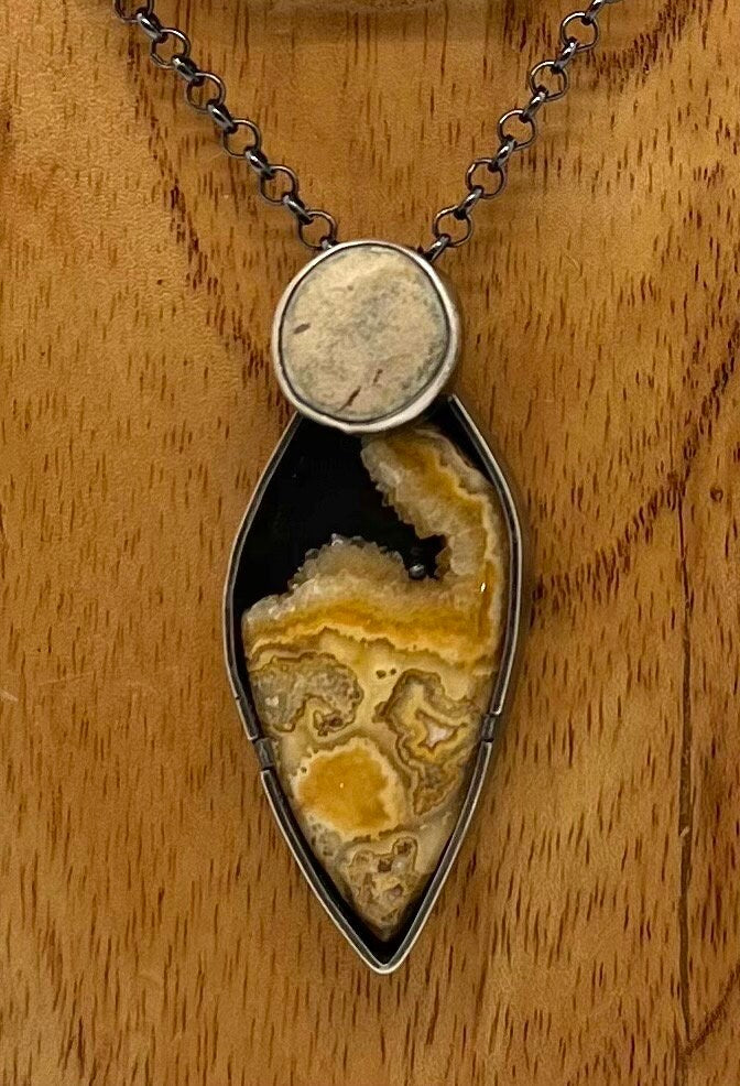 This necklace is a leaf shaped frame that has an cream colored rock bezel set inside and a druzy edged crazy lace agate tab set inside.