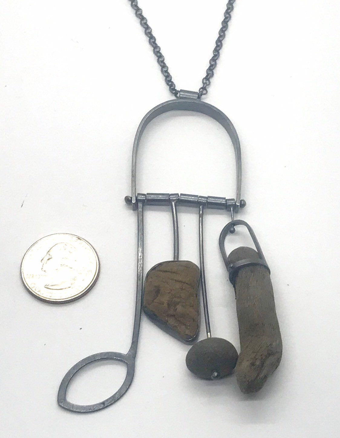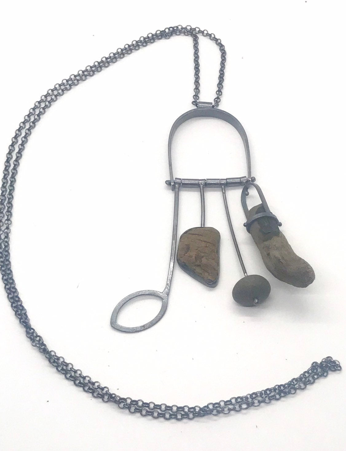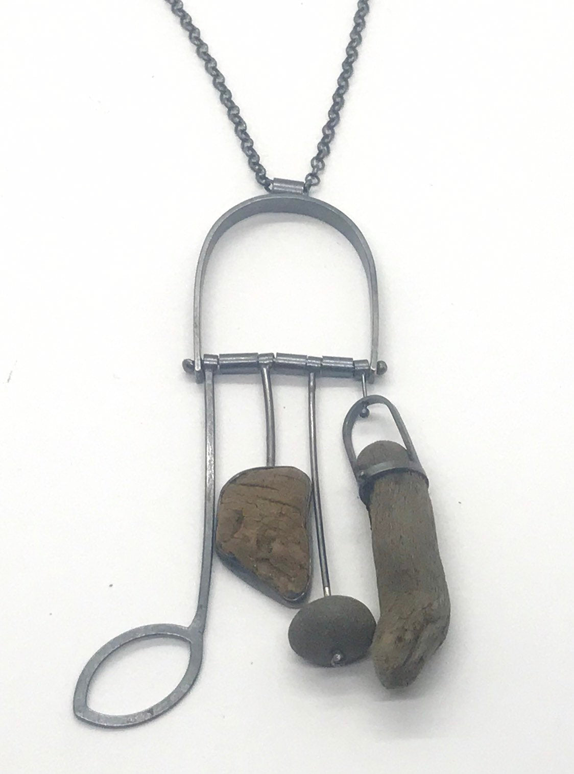 Set piece of driftwood bark, a medium grey rock and a curvy driftwood stick. It is on a heavy rolo chain. There is not a clasp as it is long enough to go over the head.