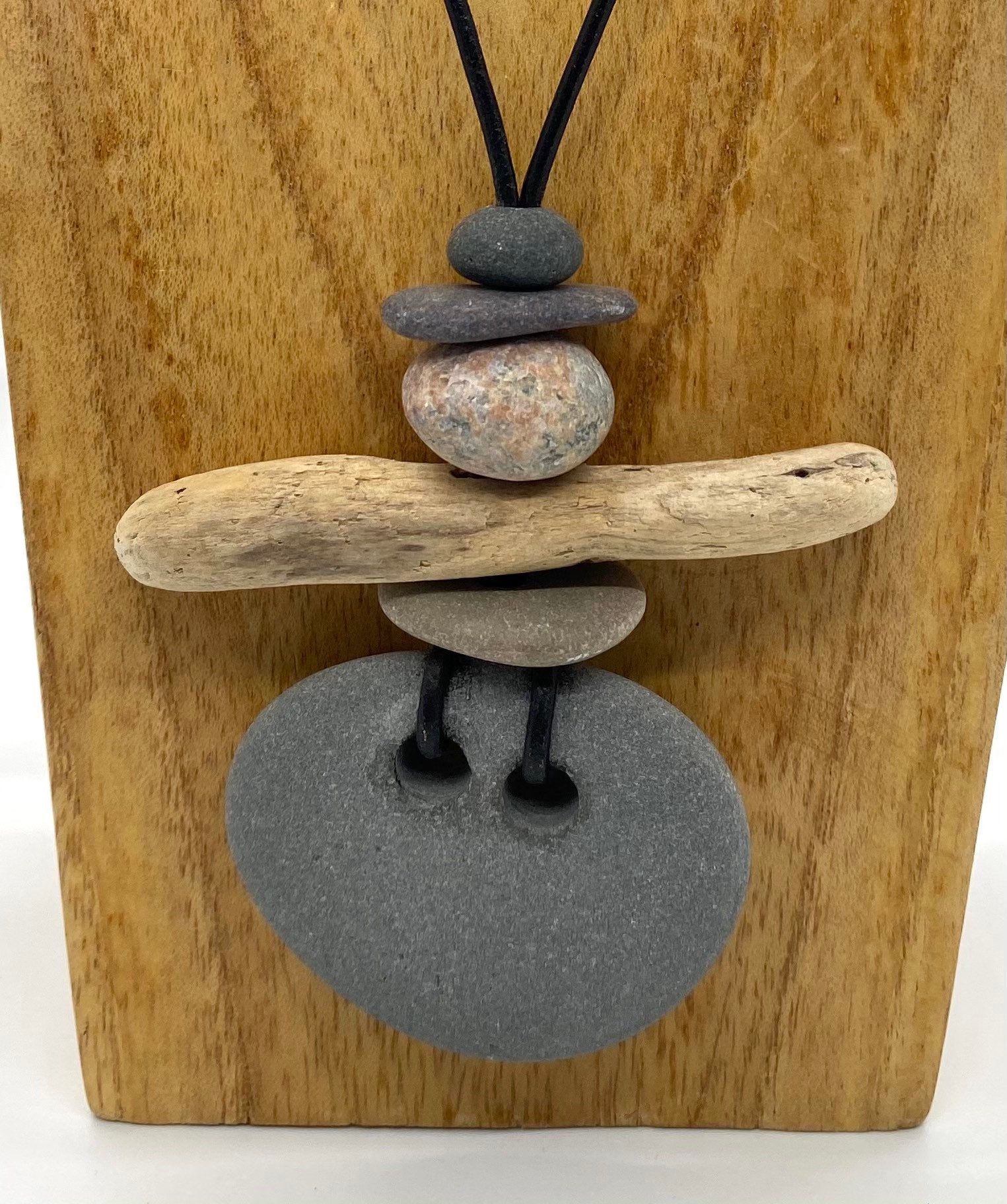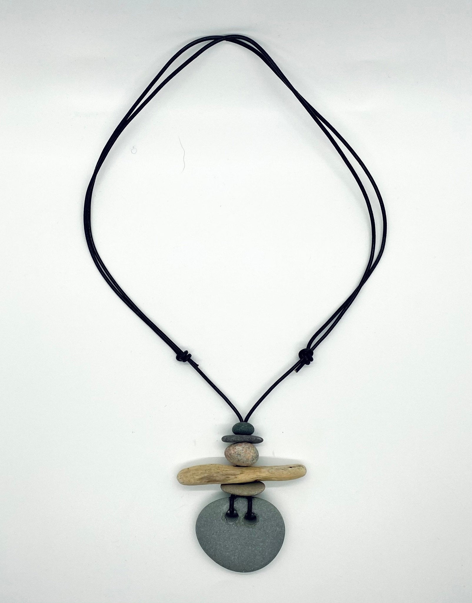 This necklace has one light grey rock as the main pendant. It also has four small accent rocks and a piece of driftwood stacked on top.