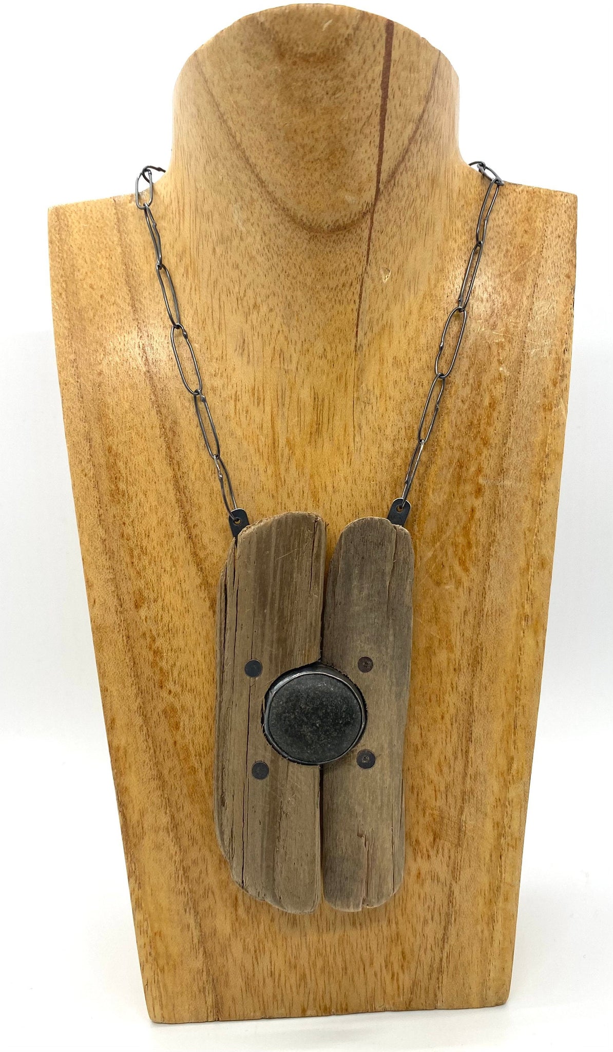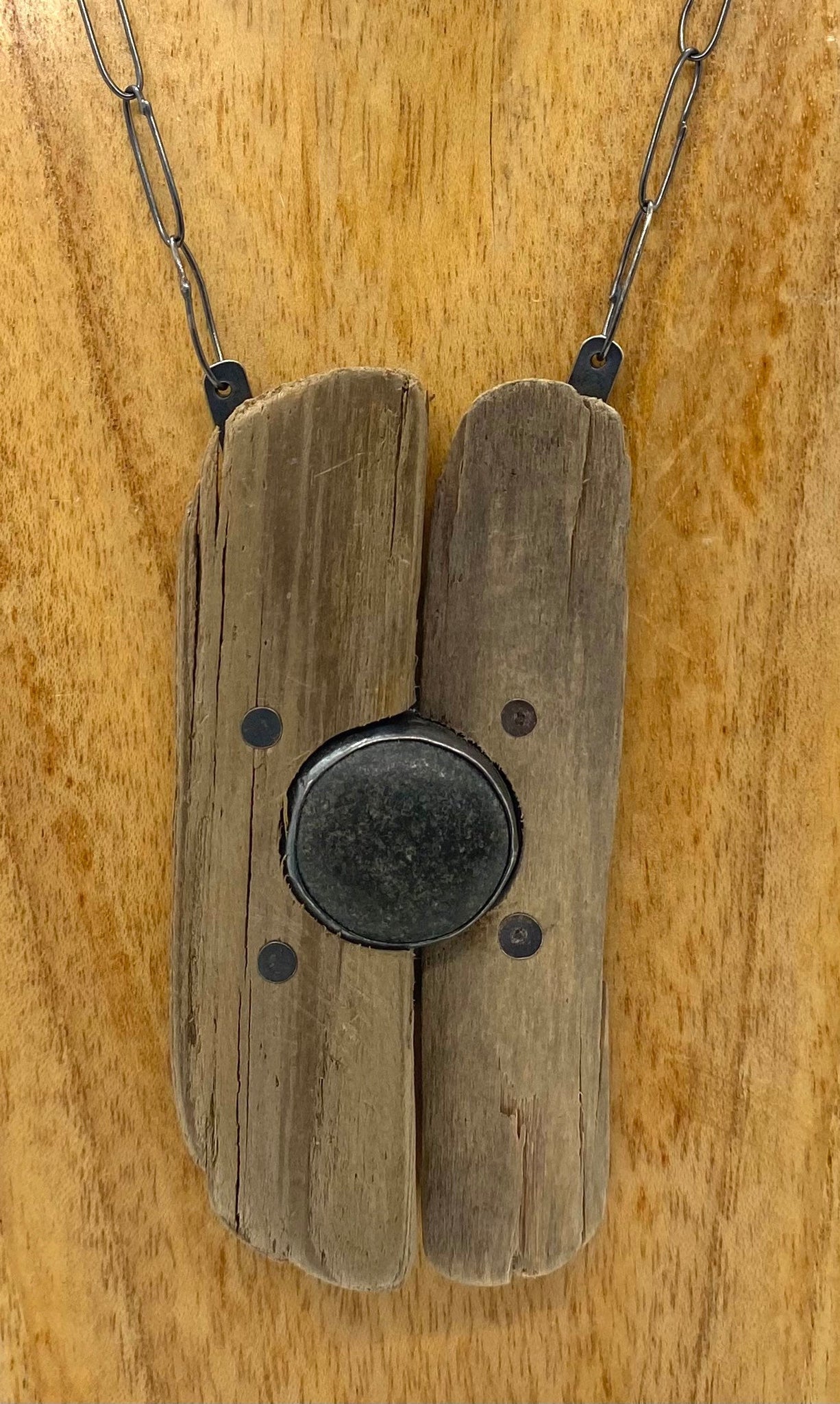 This necklace has a two flat pieces of driftwood riveted onto a piece of silver with a black bezel set rock on it.