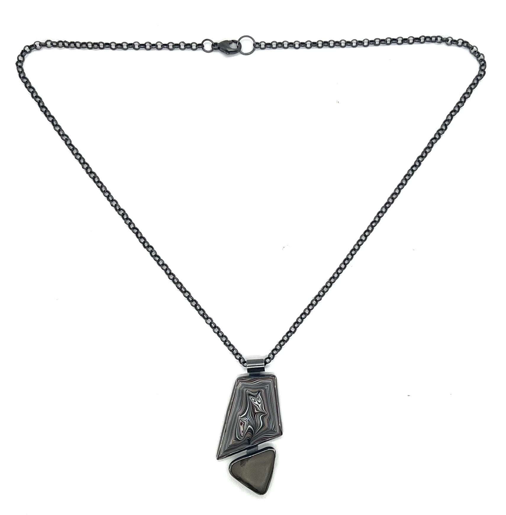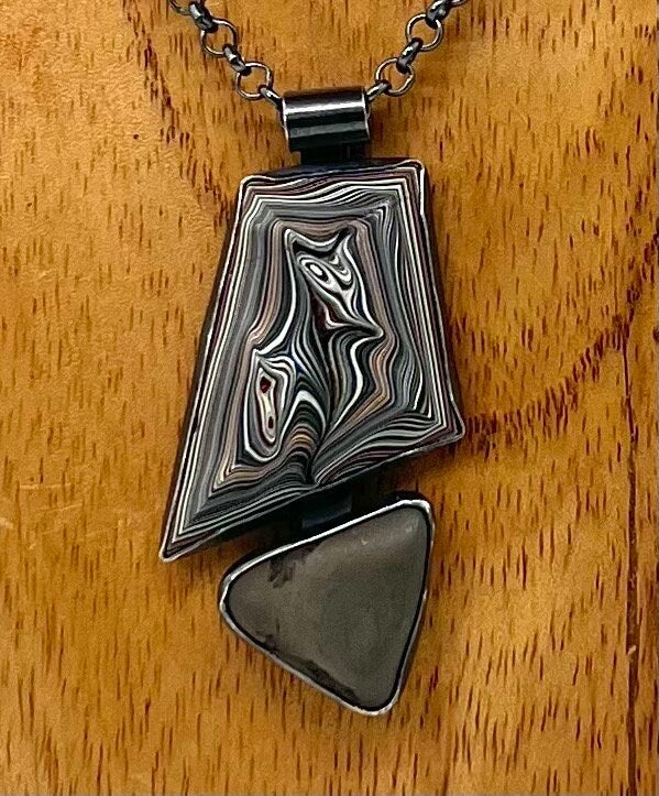 This necklace has a light grey, triangle shaped bezel set rock and a piece of Fordite that I cut and polished, bezel