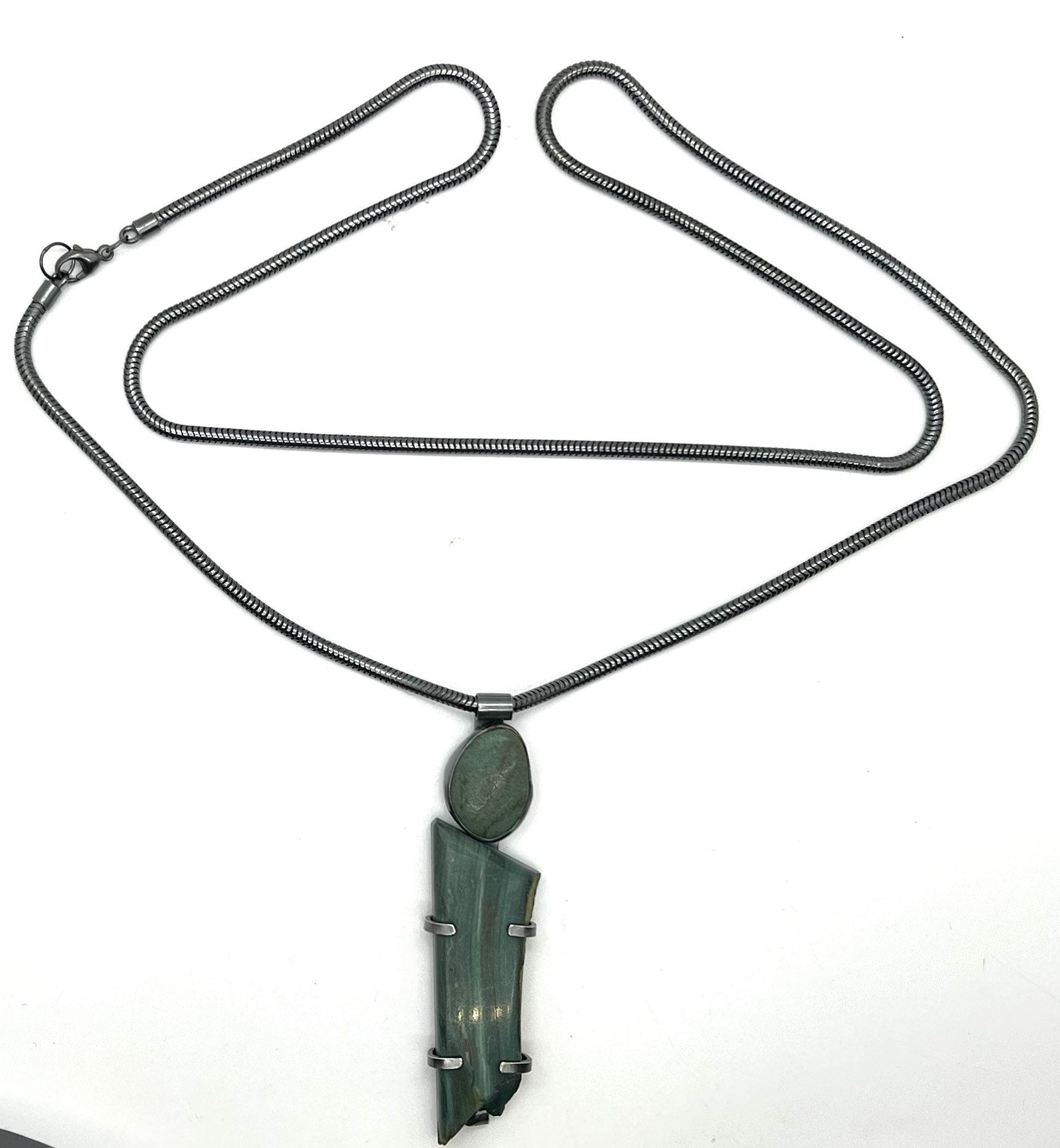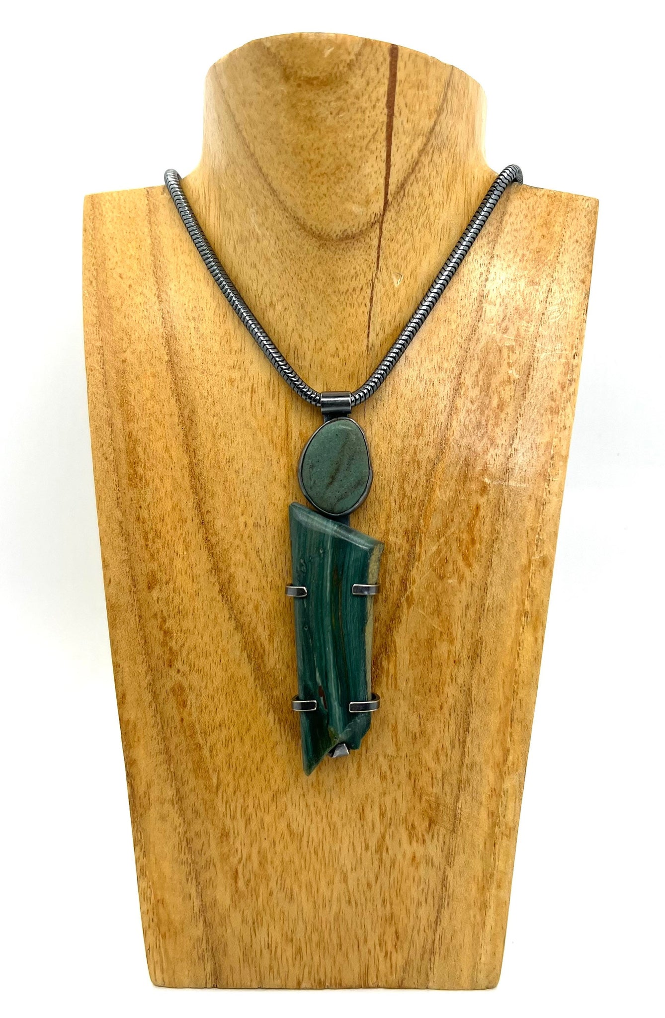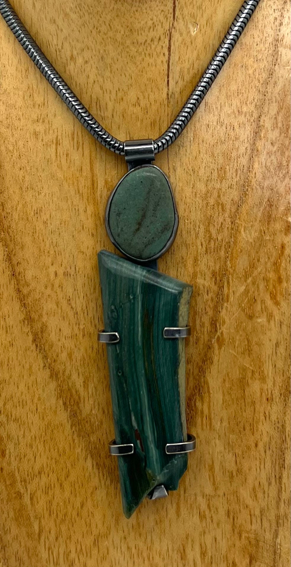 This necklace has a green rock, bezel set and a piece petrified bog wood that is prong set below it..
