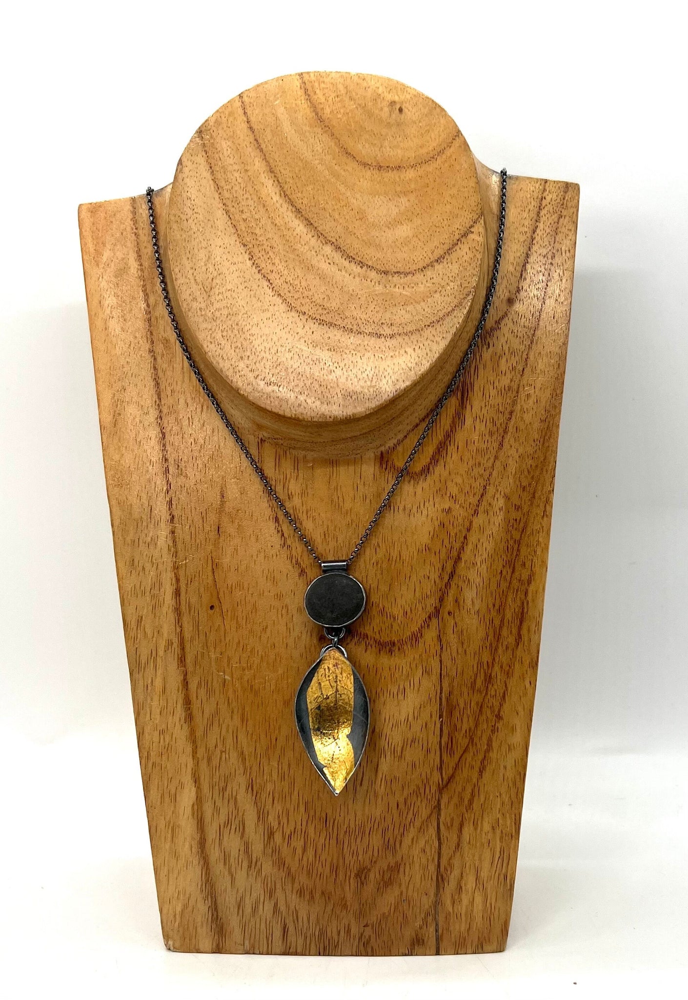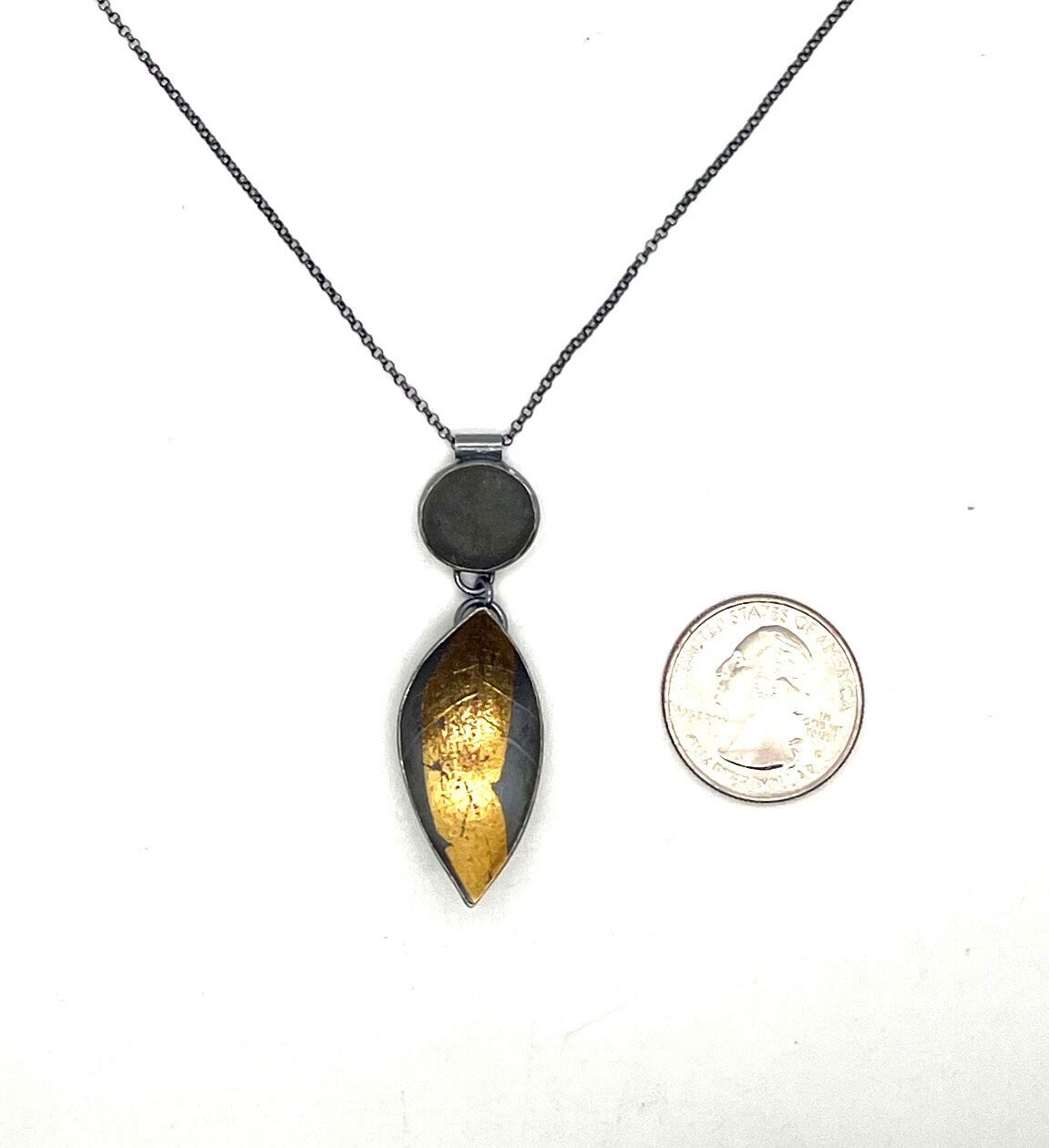 This rock is medium grey and is bezel set, linked to a leaf shape with a leaf vein pattern embossed into it. The leaf has some 22k gold leaf fused to it. It is on a rolo chain with a lobster clasp.