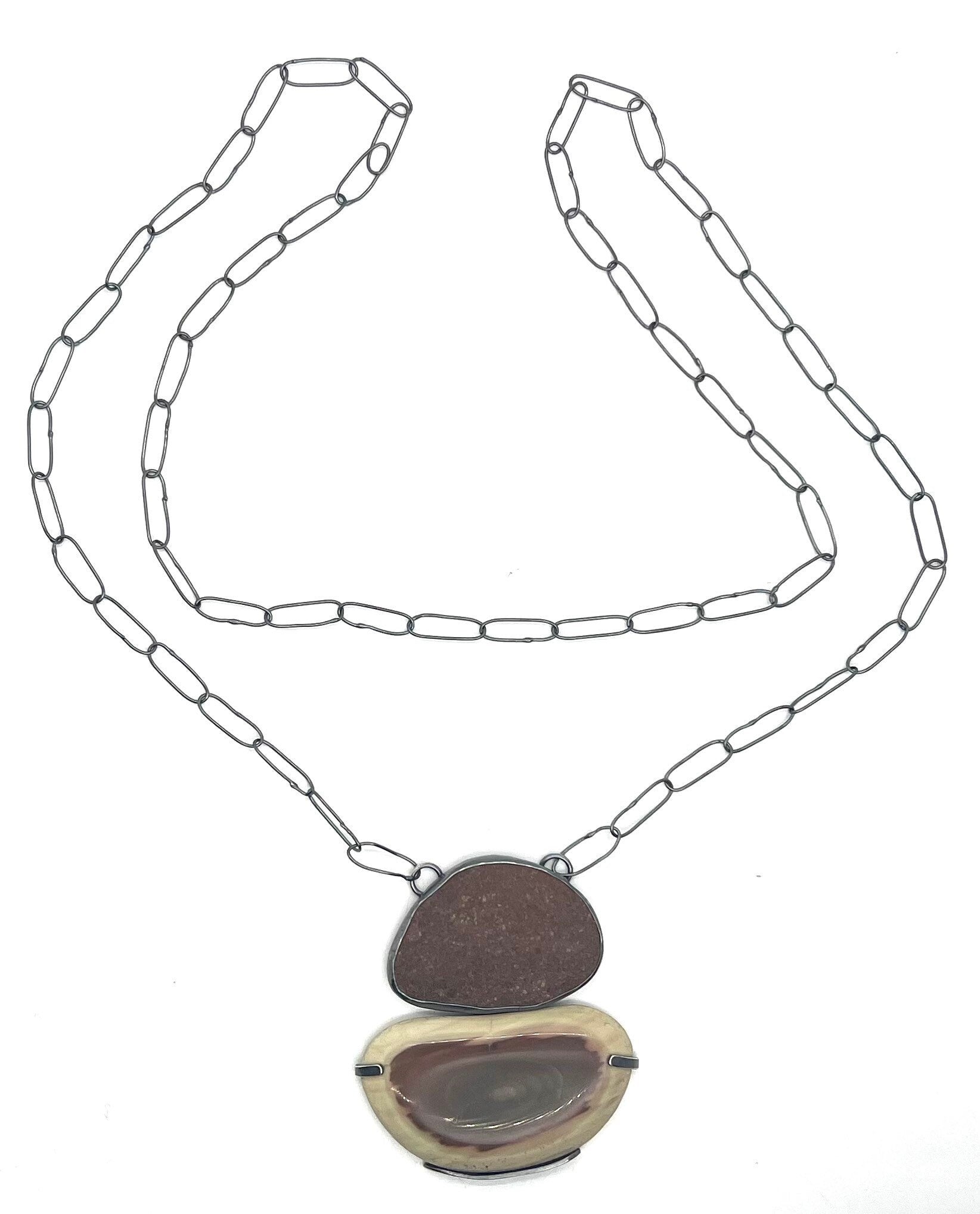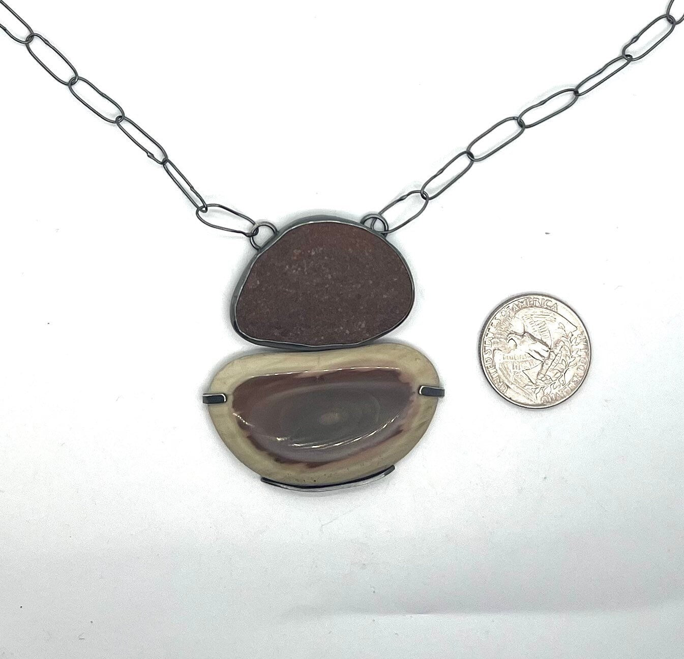This necklace has one bezel set reddish brown rock and an Imperial Jasper cabochon that I cut and polished myself(it’s not from Lake Superior). It’s tab set below the rock. It has a handmade chain without a clasp as it’s long enough to go over the head.