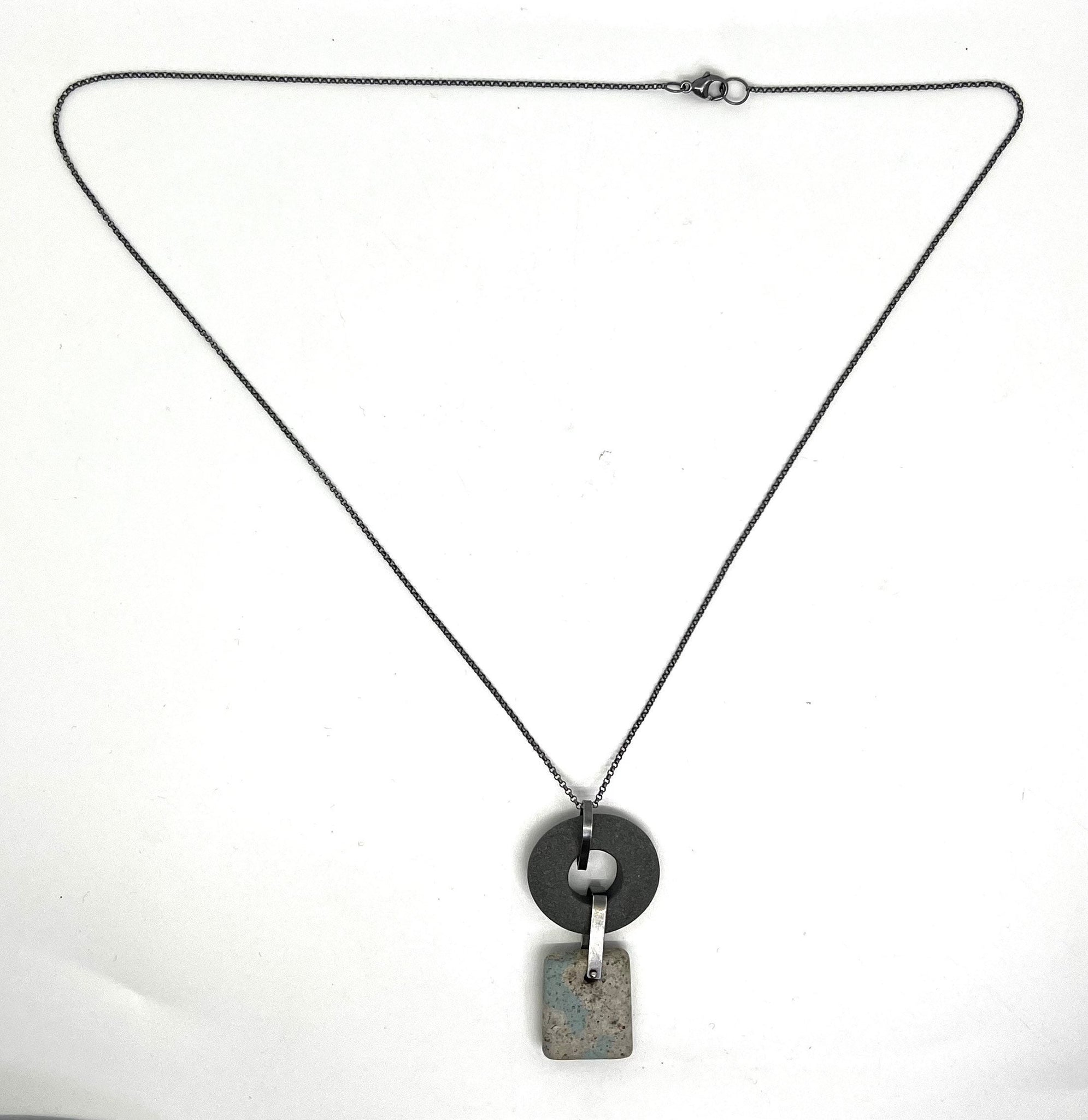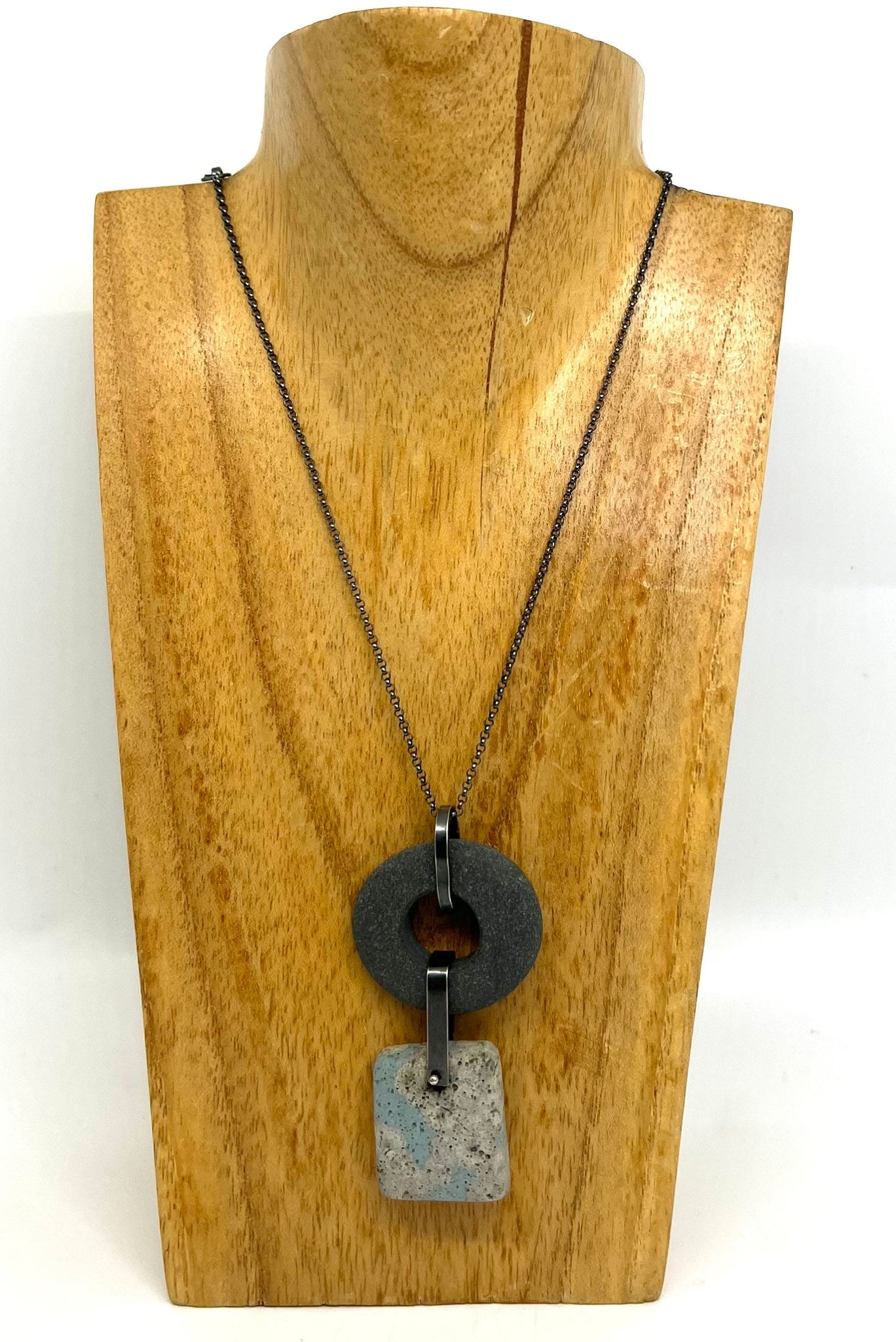 This pendant is is a light grey rock that has a large hole drilled in it that is linked by rivet to a rectangle of Leland Blue. It’s is on a silver rolo chain with a lobster clasp.