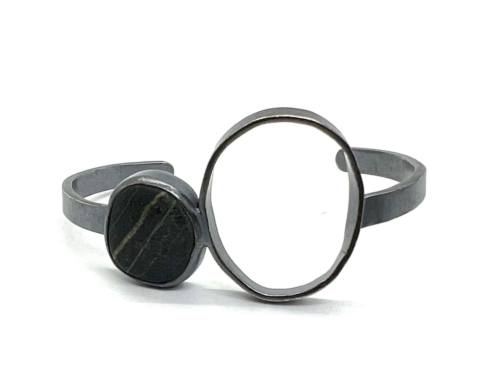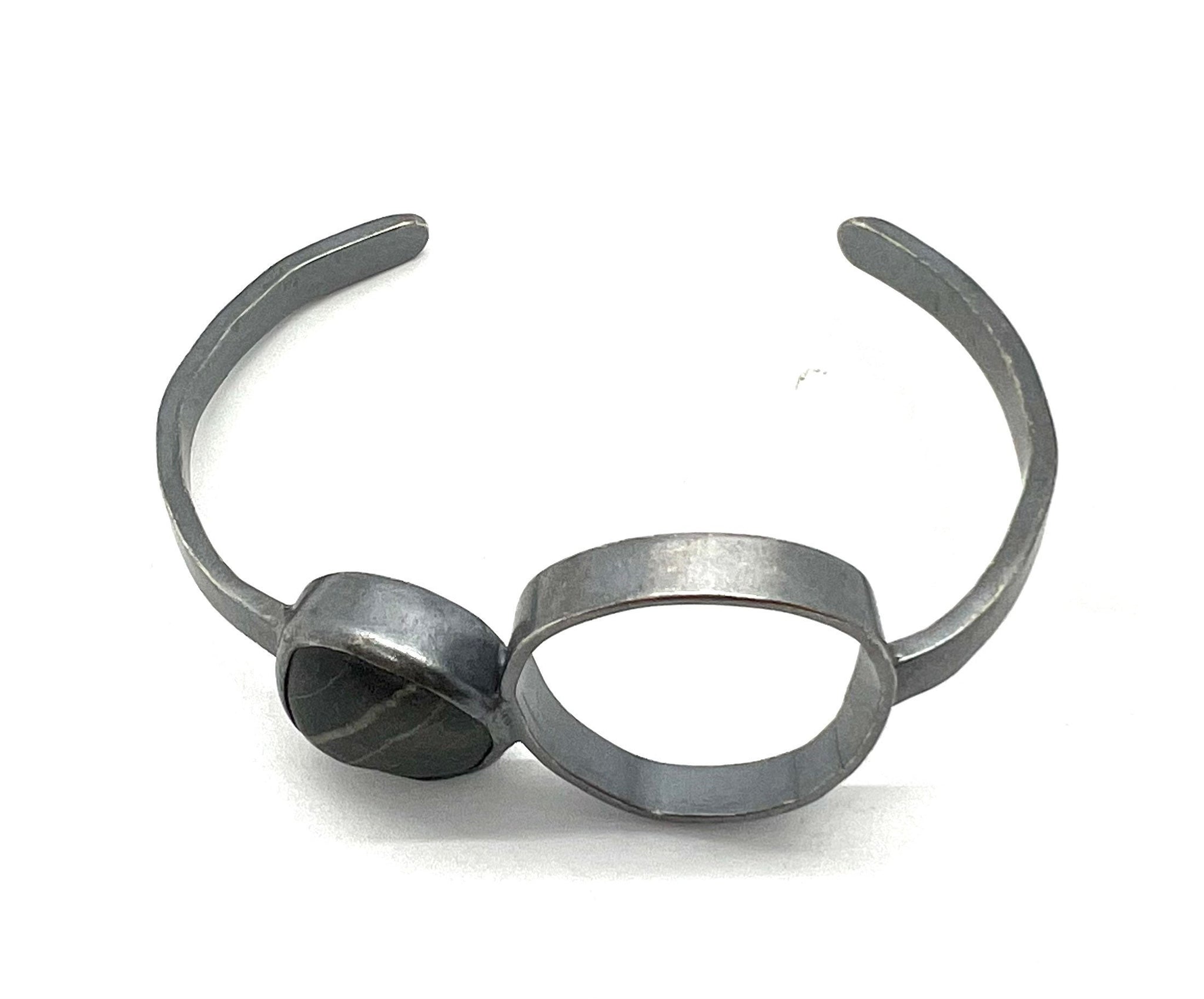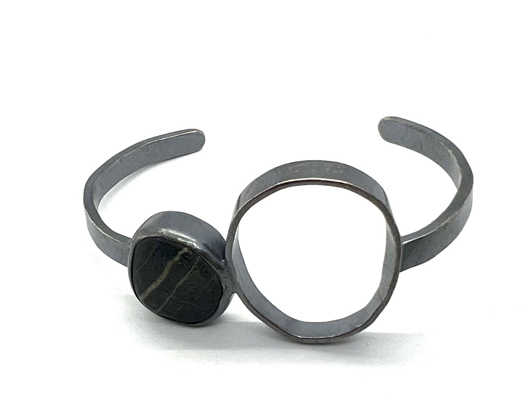 This bracelet has an oval shape with a dark grey bezel set rock with lines in it, on a narrow sterling cuff.