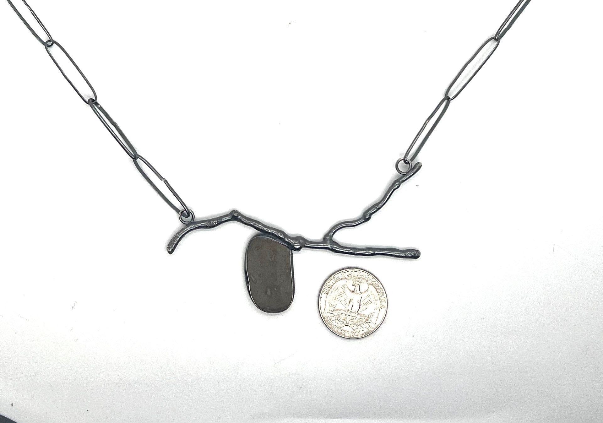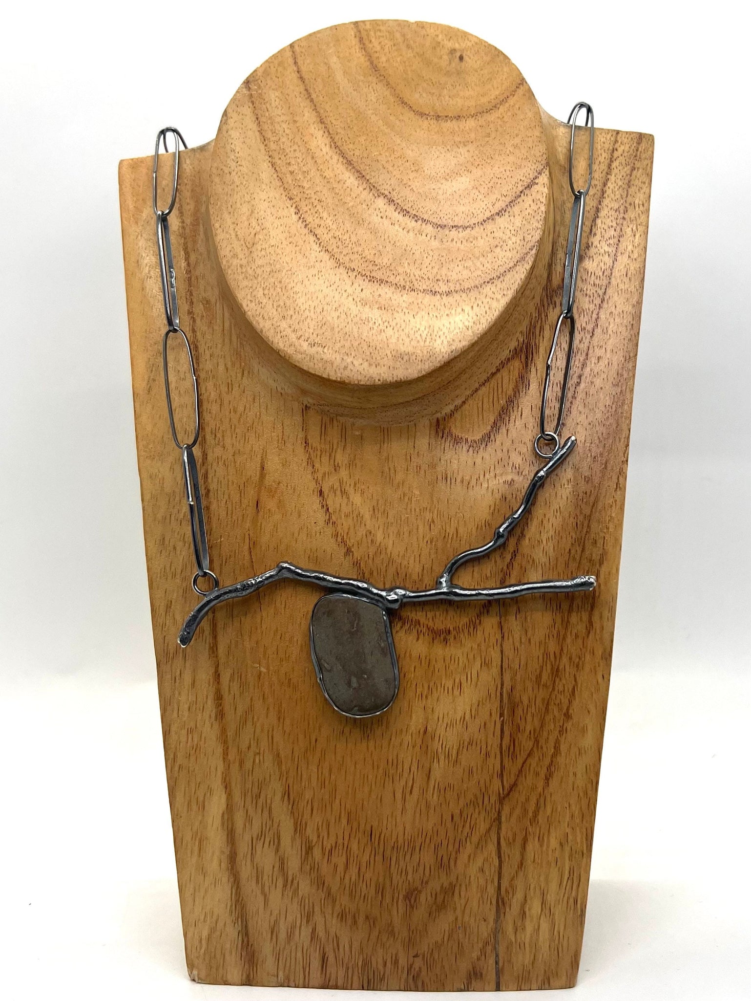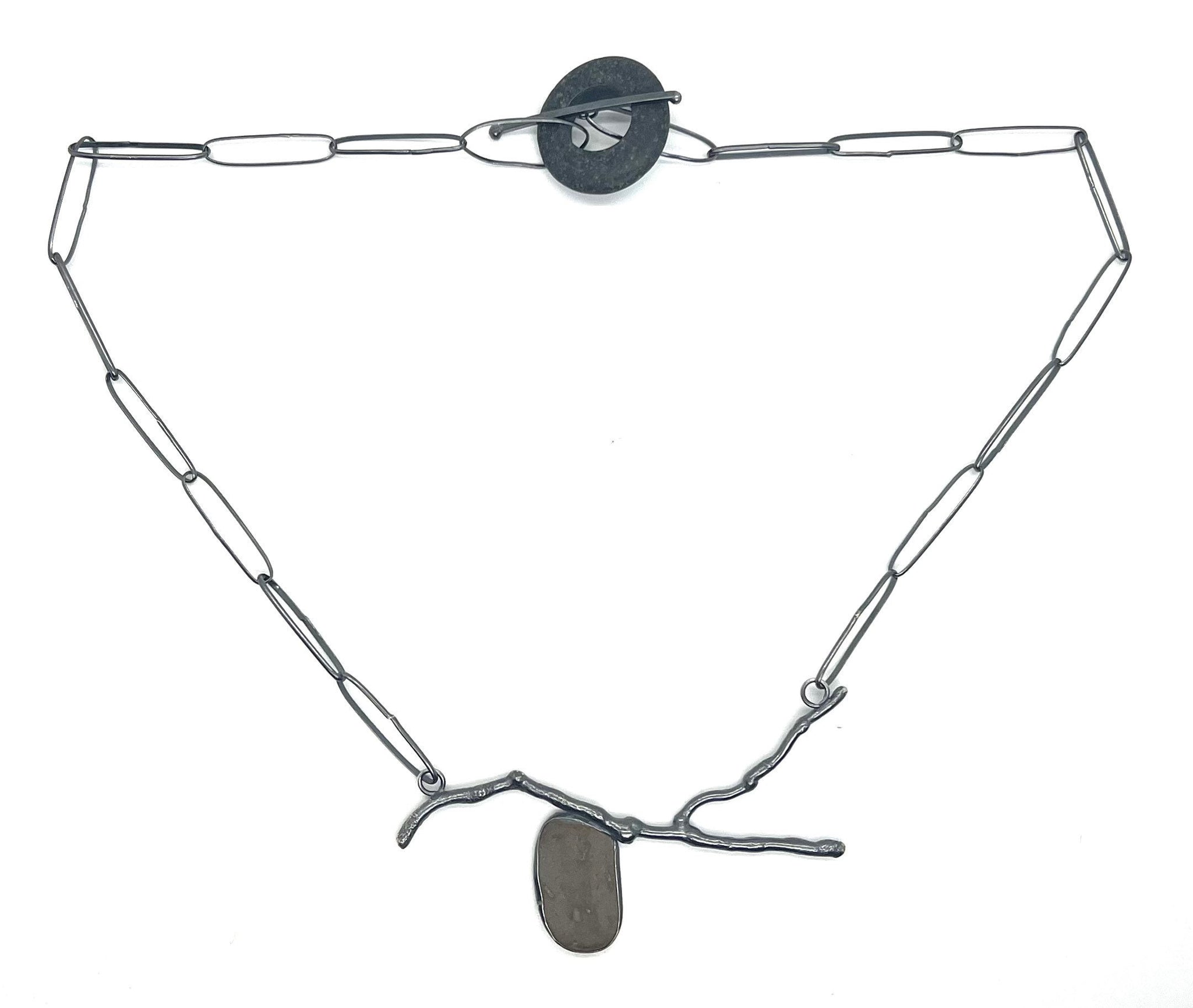 This pendant is a silver “twig” that I made by melting silver wire, with a medium grey brownish rock bezel set below it. It has a handmade sterling chain with a rock toggle clasp.