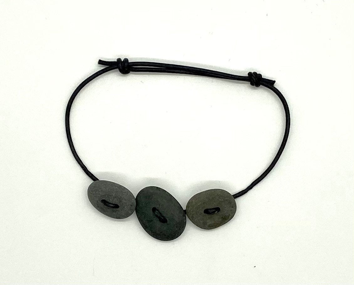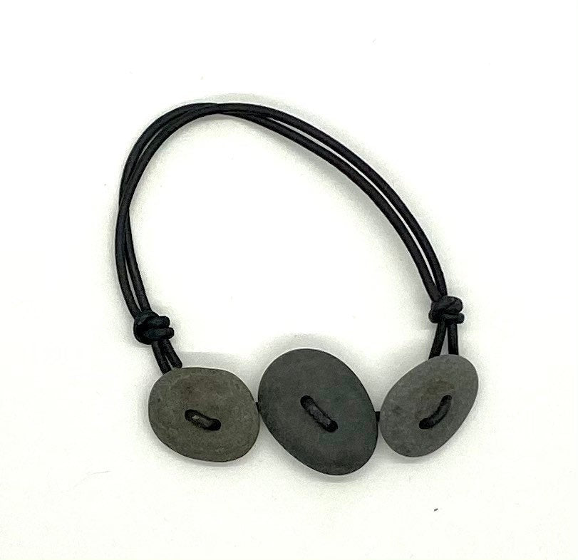 This piece has 3 rocks, two lighter grey and one dark grey rock in the middle. They are on a adjustable leather cord.