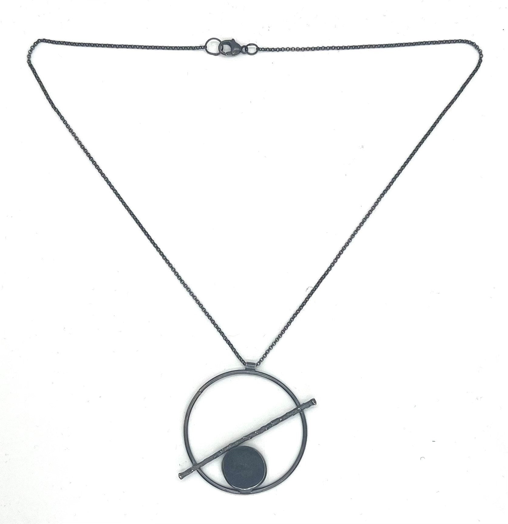 This pendant is a silver circle with a medium grey rock bezel set inside and a cast silver twig placed diagonally across it. It is on a sterling rolo chain with a lobster clasp.
