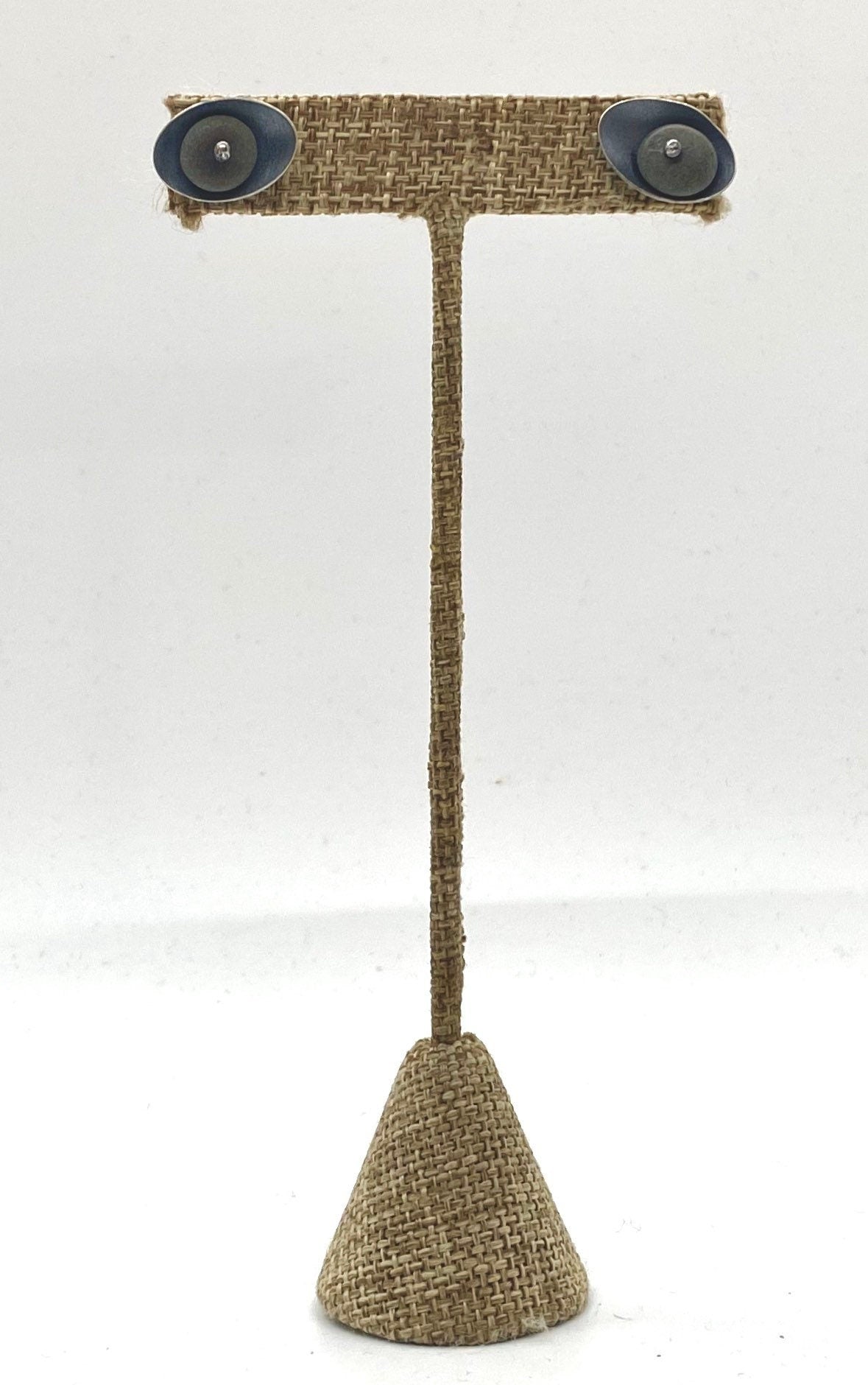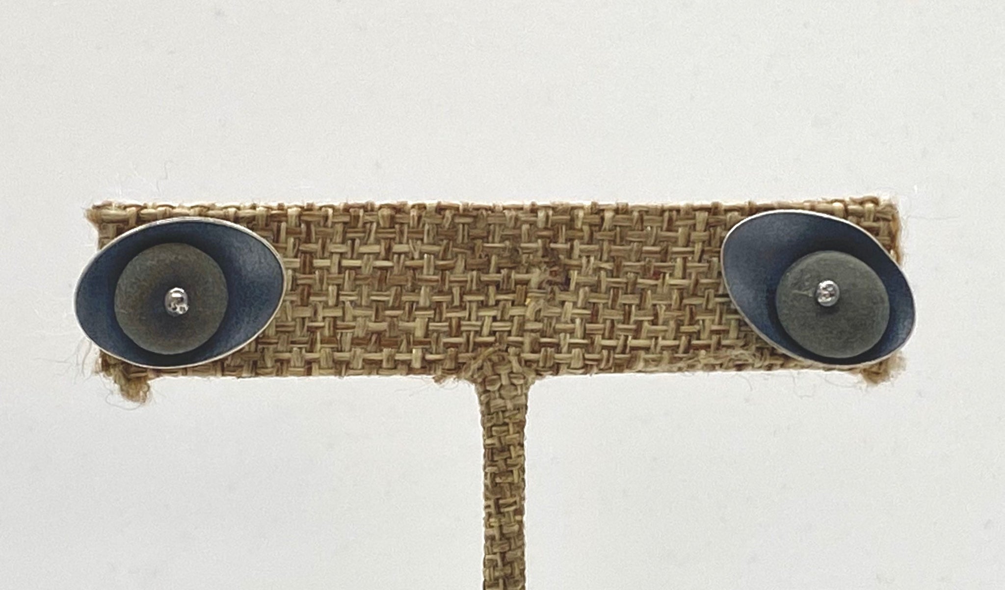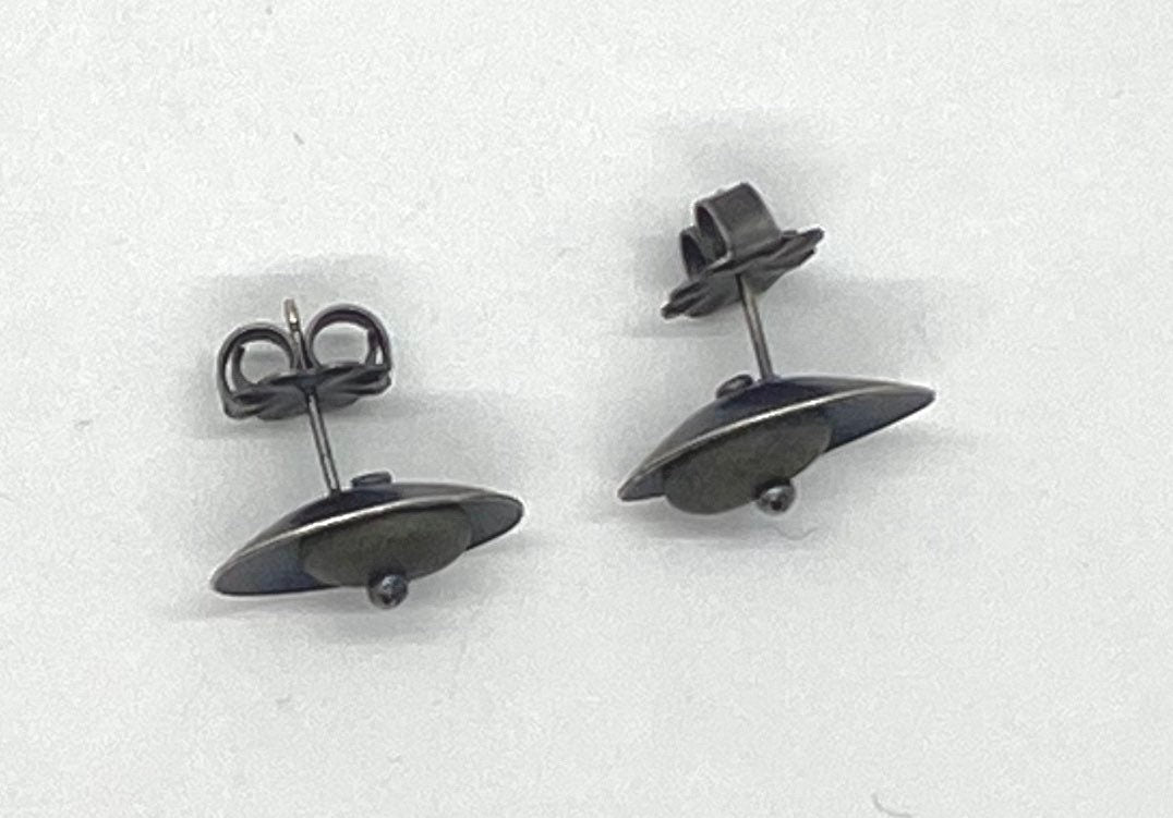 These rocks are medium grey and smooth. They are pinned onto a domed oval with silver earring posts soldered on the back.
