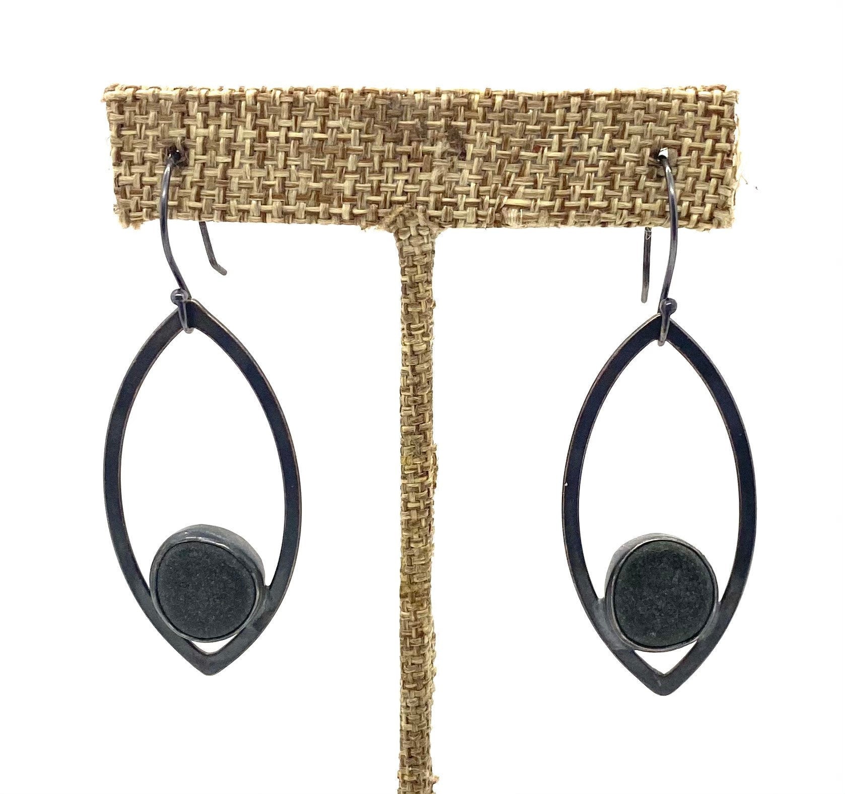 These earrings are made with stones from Lake Superior and sterling silver. The silver is oxidized to get the grey color.