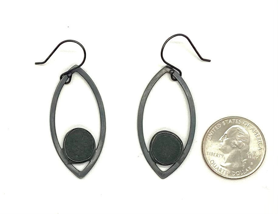 These rocks are dark grey and smooth. They are bezel set inside a leaf shape. The earwires are sterling silver and handmade.