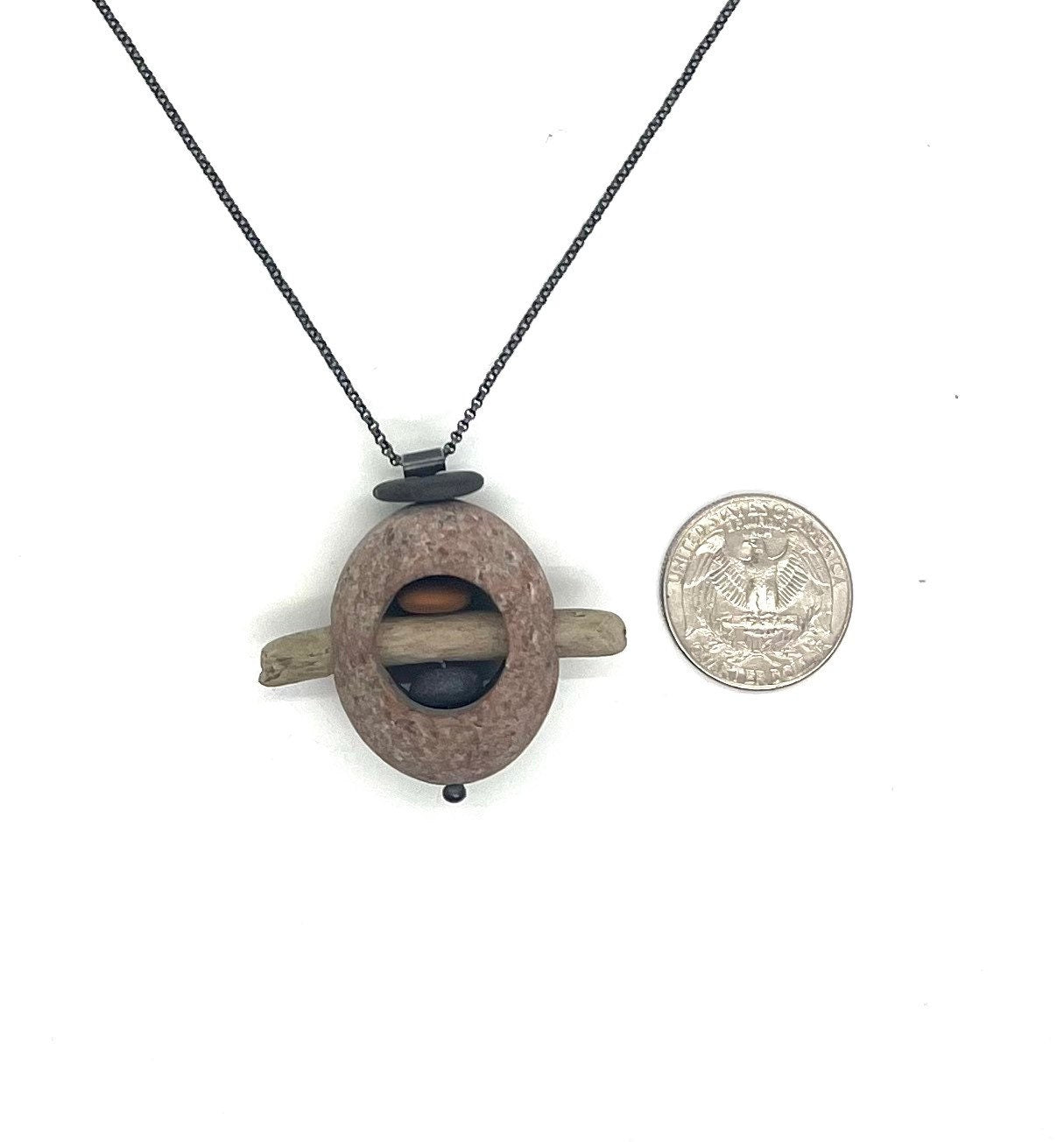 This piece is made with stones from Lake Superior and sterling silver. The silver is oxidized to get the grey color.