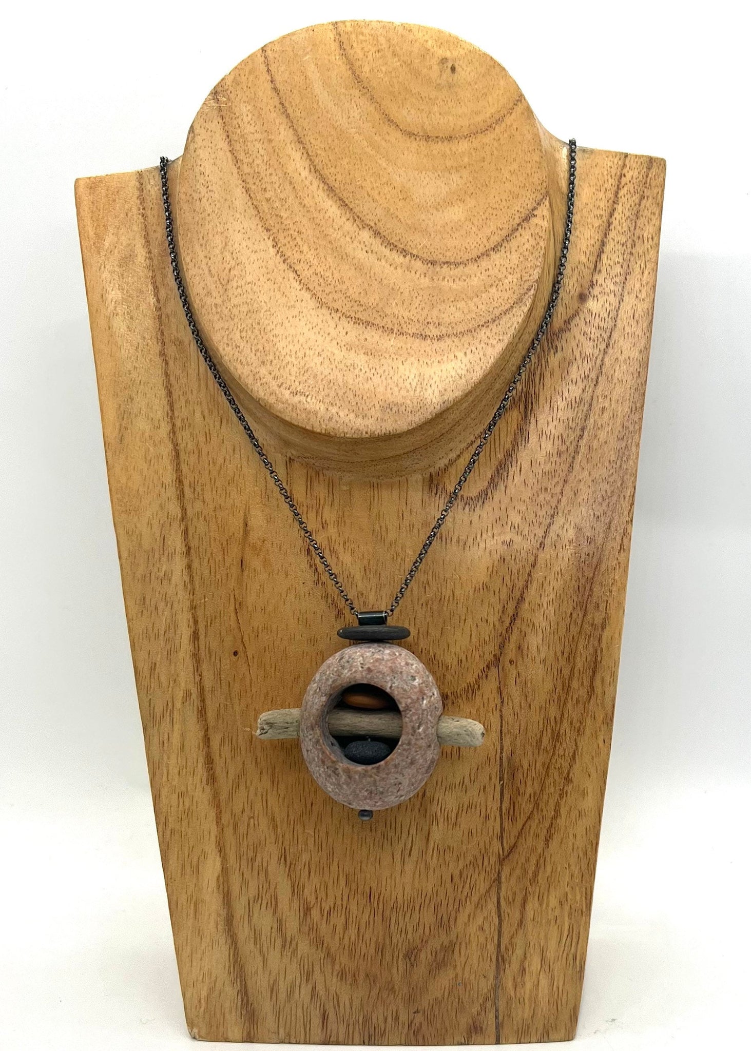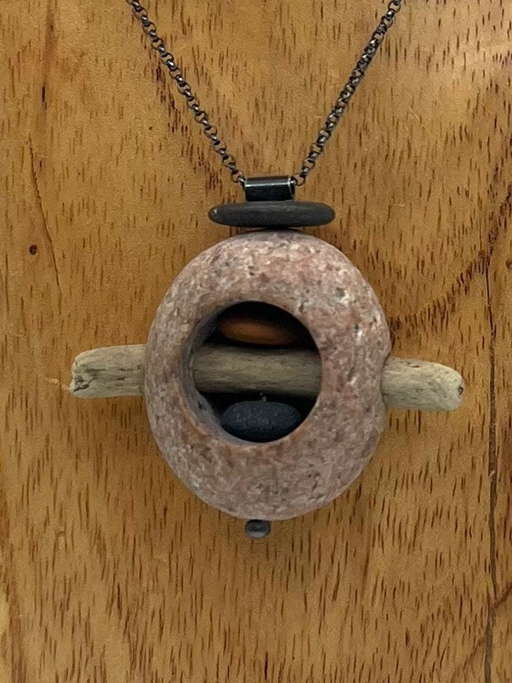 This necklace, the main rock is pink granite. It has a stack of 2 rocks of varying shades pinned inside all big with a piece of driftwood going through it. It is on a sterling silver rolo chain with a lobster clasp.
