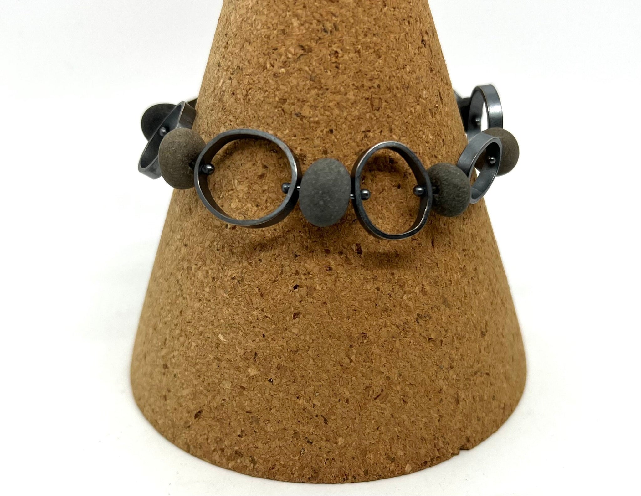 This piece is made with stones from Lake Superior and sterling silver. The silver is oxidized to get the grey color.