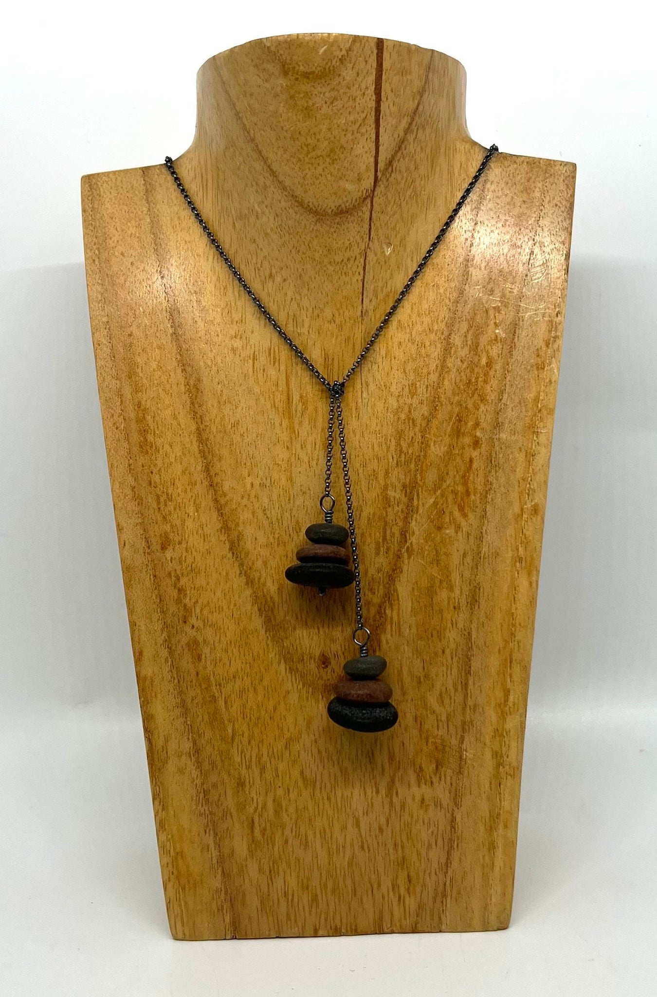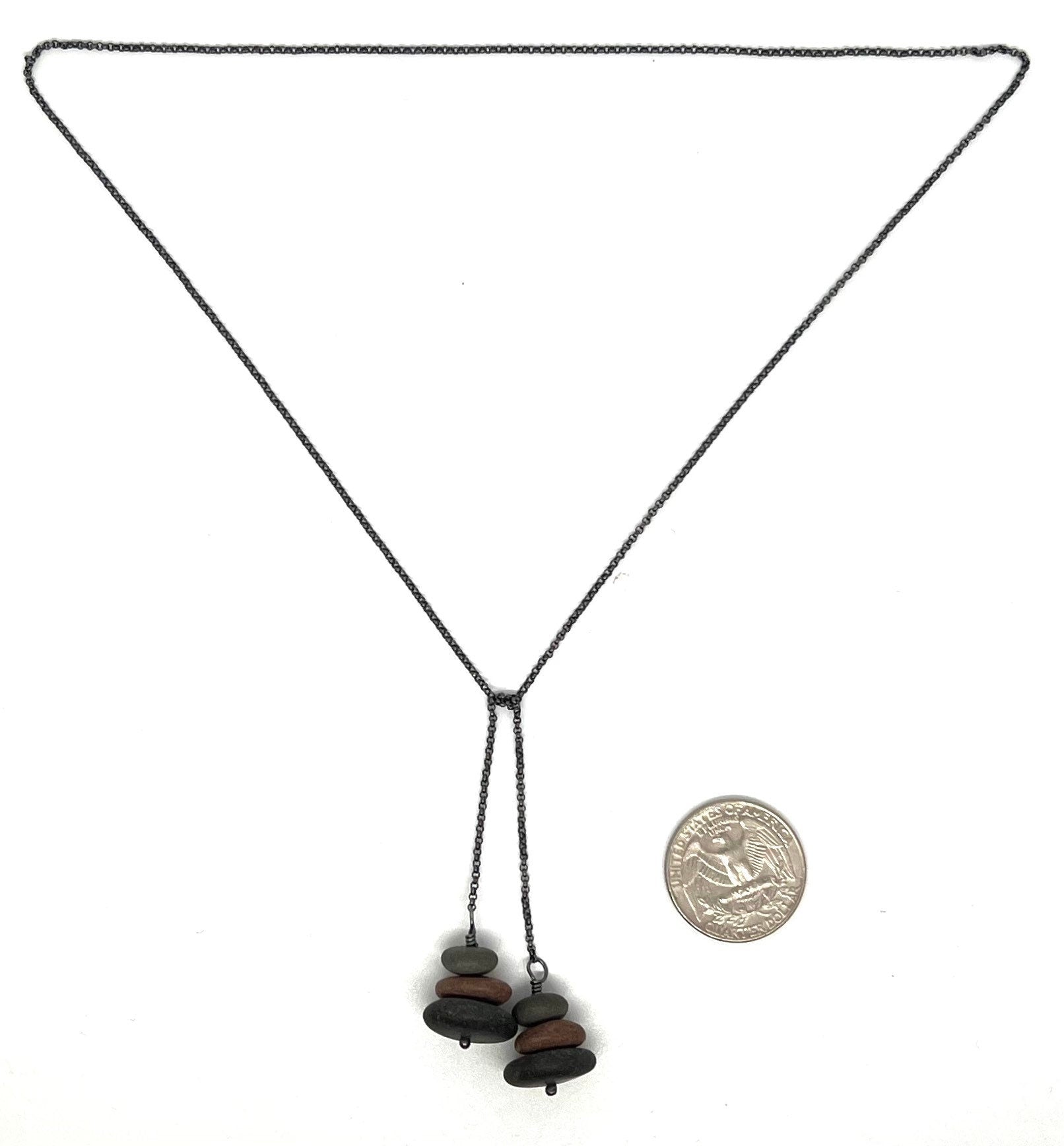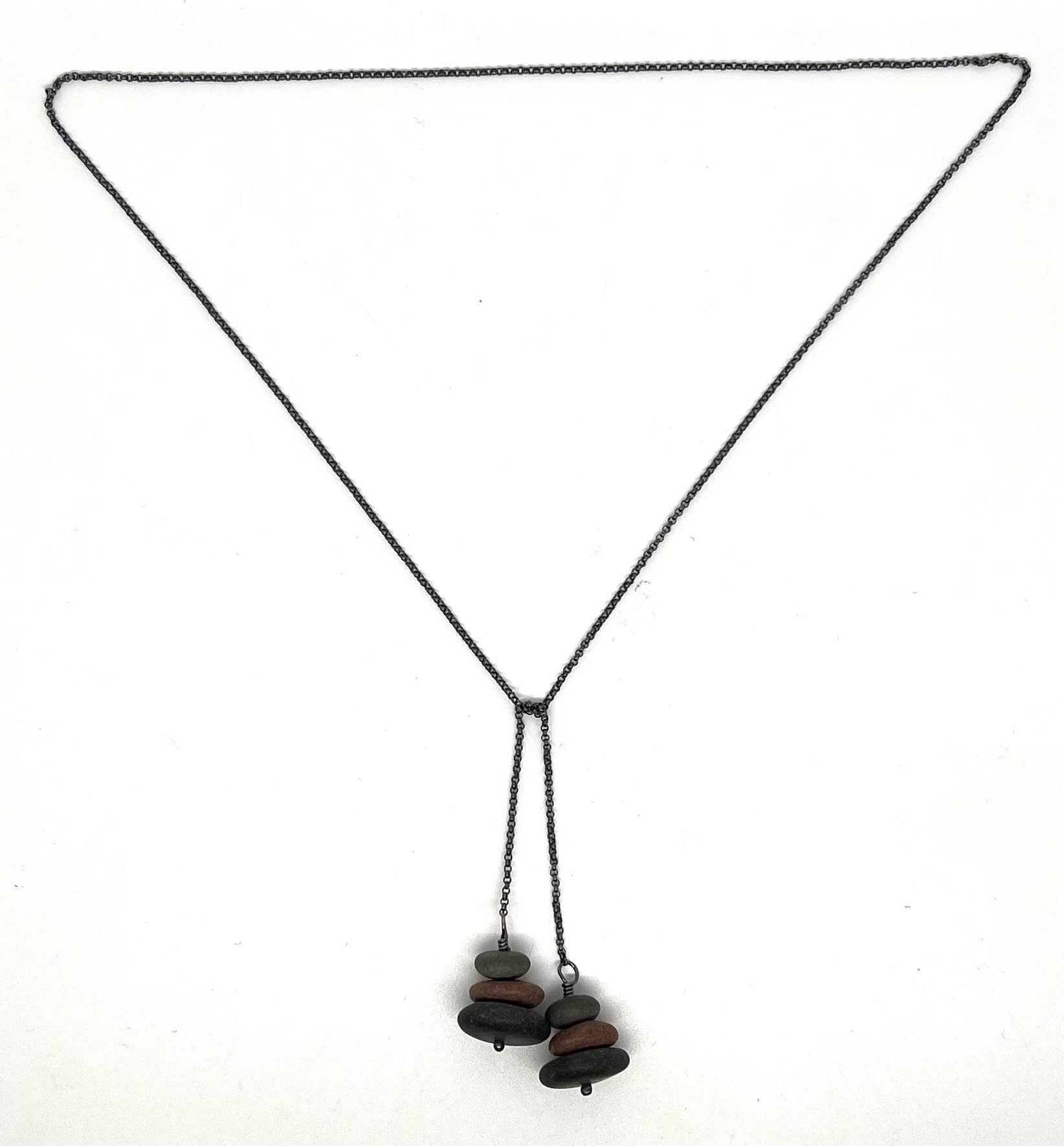 This piece is made with stones from Lake Superior and sterling silver. The silver is oxidized to get the grey color.