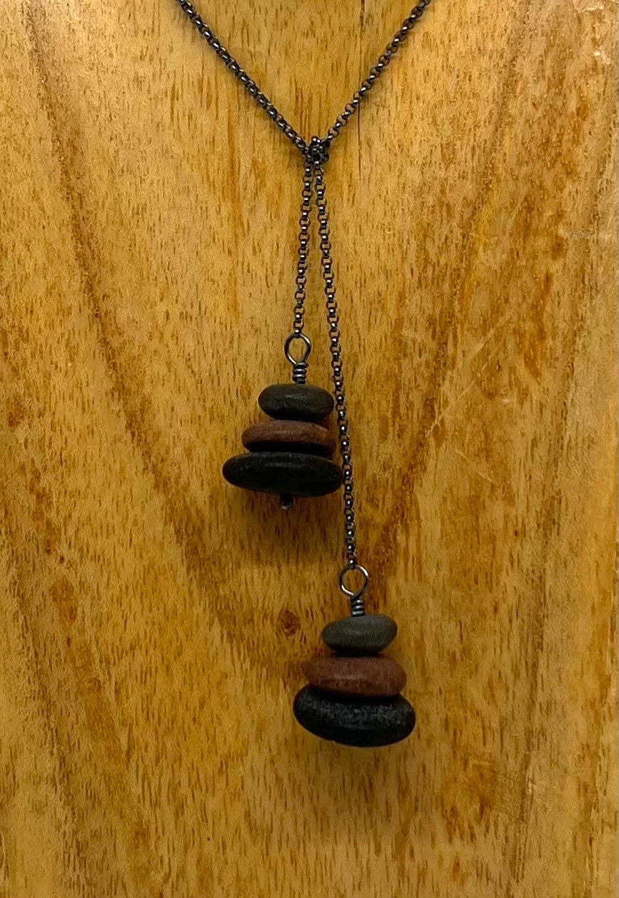 This piece has two stacks of three rocks each, with light grey, reddish brown and dark grey rocks. It is meant to tie in front.