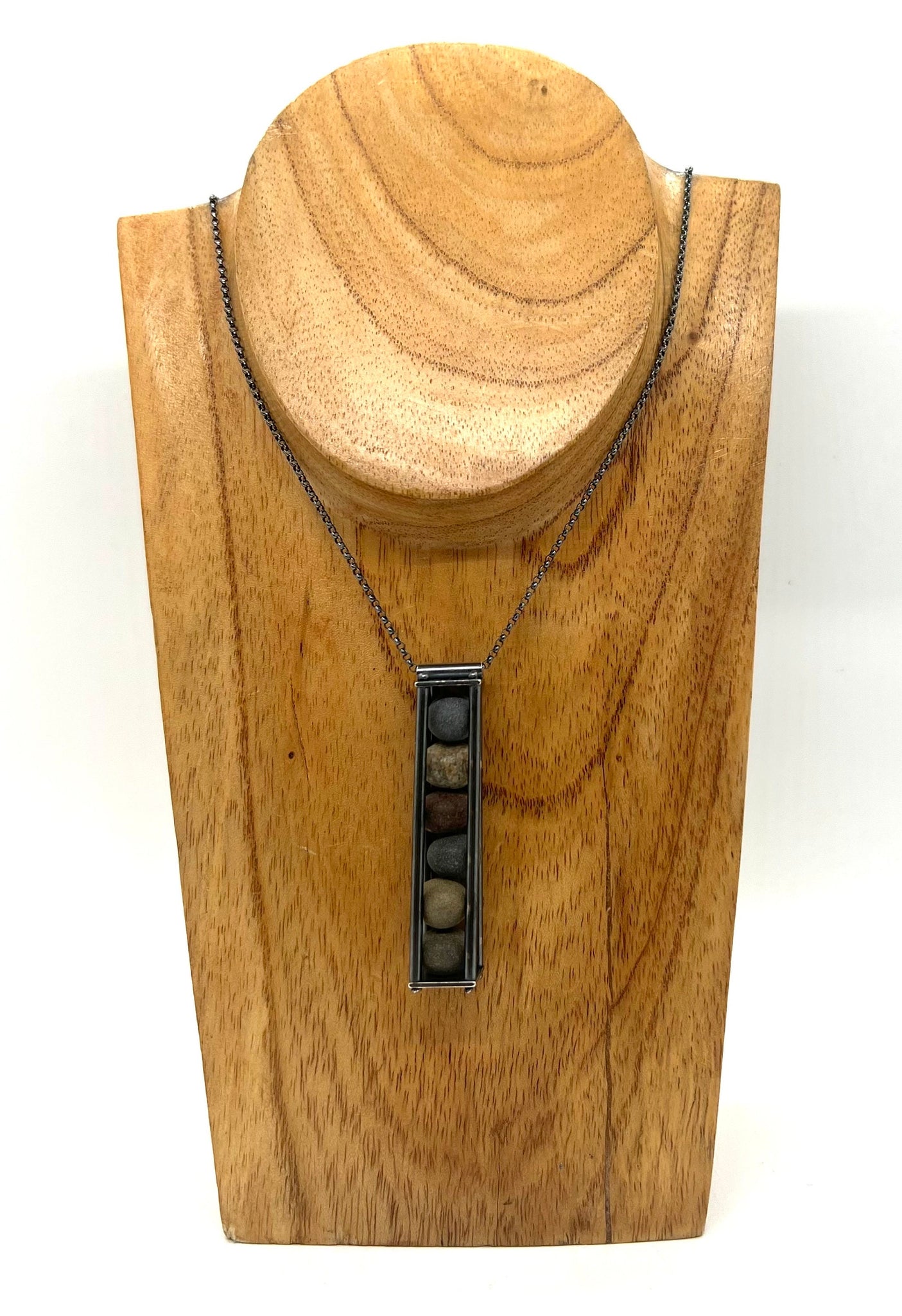 This piece is made with stones from Lake Superior and sterling silver. The silver is oxidized to get the grey color.
